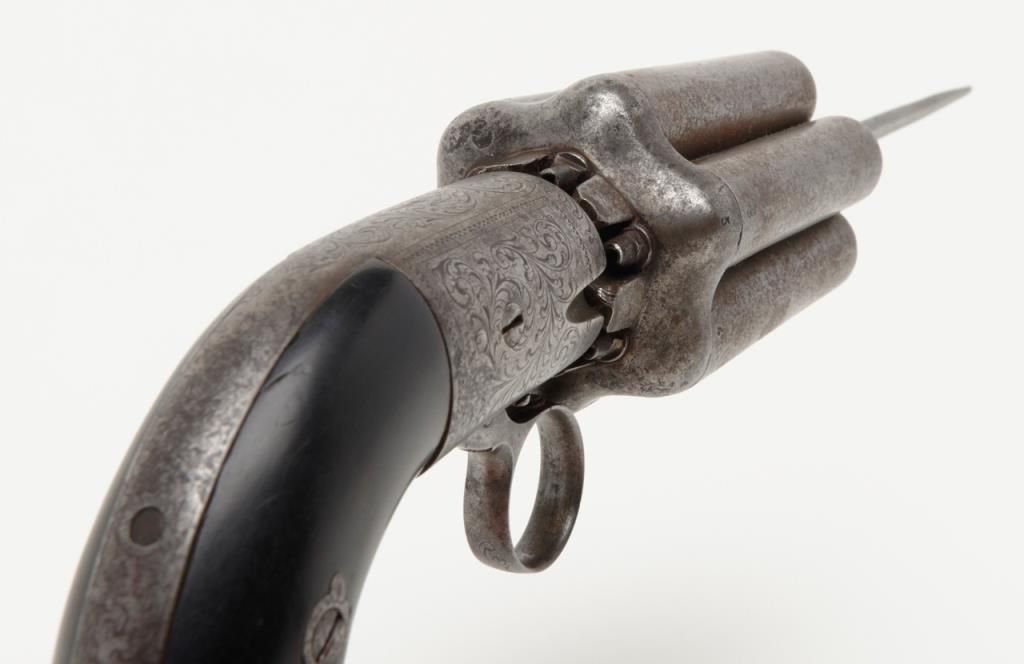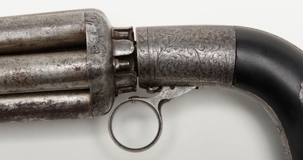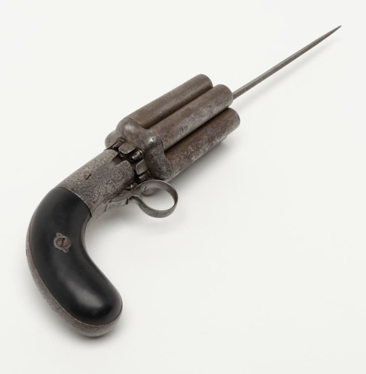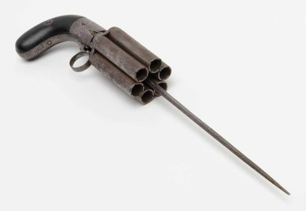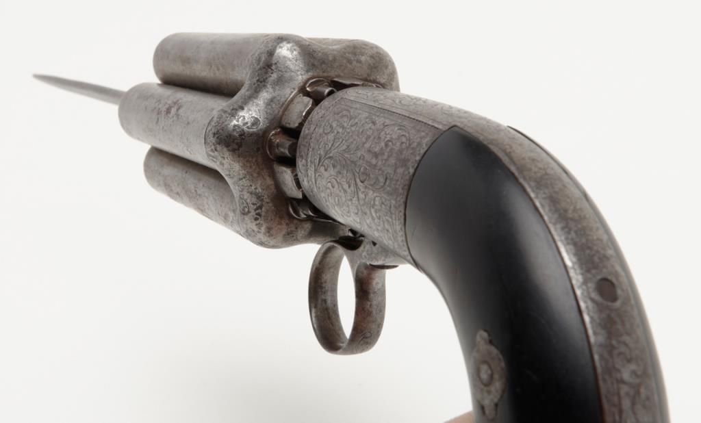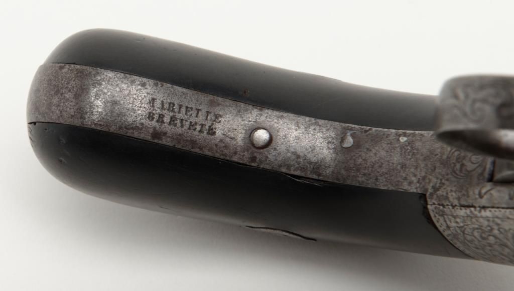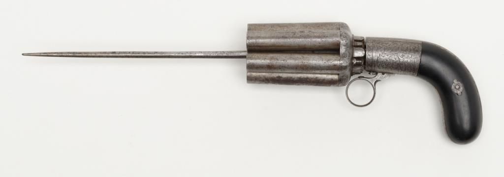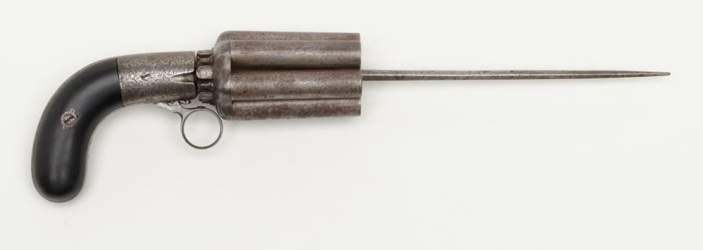 Original Marietie pepperbox 6 barrel percussion pistol with dagger, ex-Ratner collection and pictured in Blades and Barrels reference book, .54 cal., 3” barrels that are each numbered (e.g. 1, 2, 3, etc.), scroll engraved frame, ebony grips,#4 under left grip on strap with initials “JMV”. This oddity is in overall very good condition showing a brown patina on the barrel assembly and grey patina on the frame, good action, very good grips; a beautiful, un-cleaned piece pictured inthe foremost book on the subject of these guns and with provenance to one of the finest collections of this type in the United States. (Antique). Est.: $3,000-$6,000