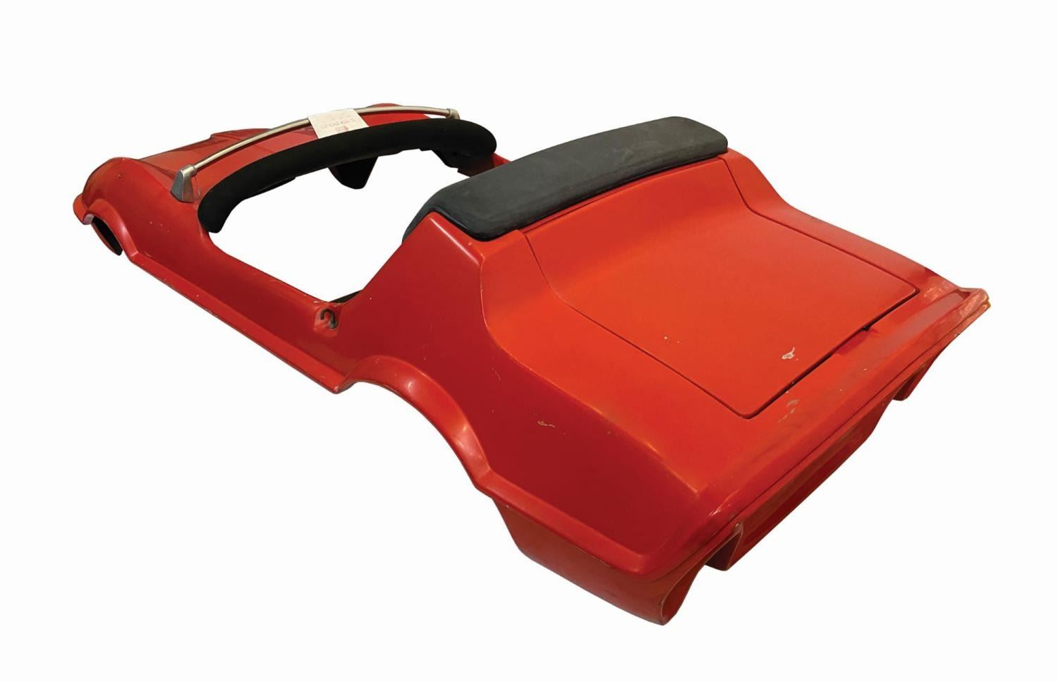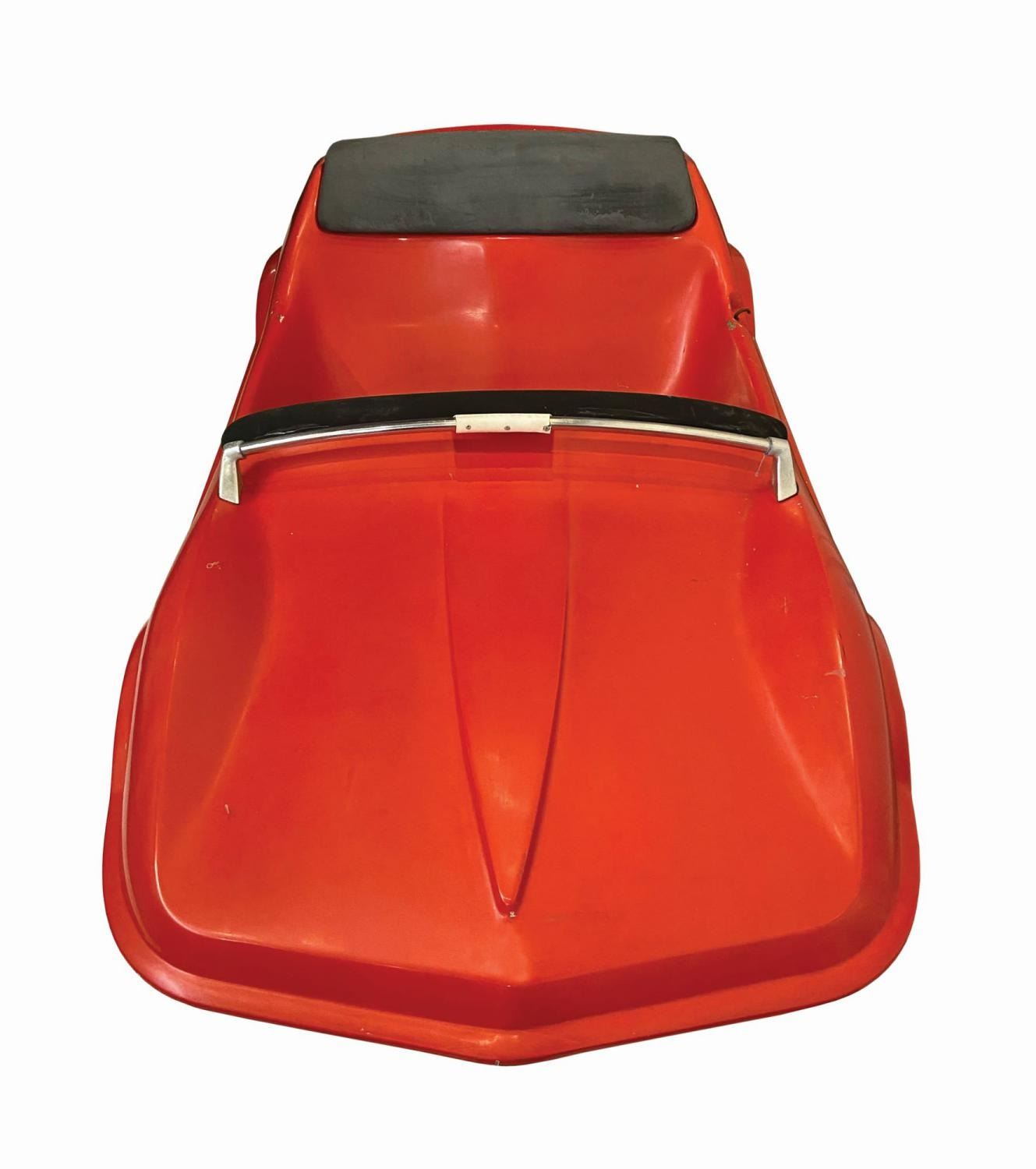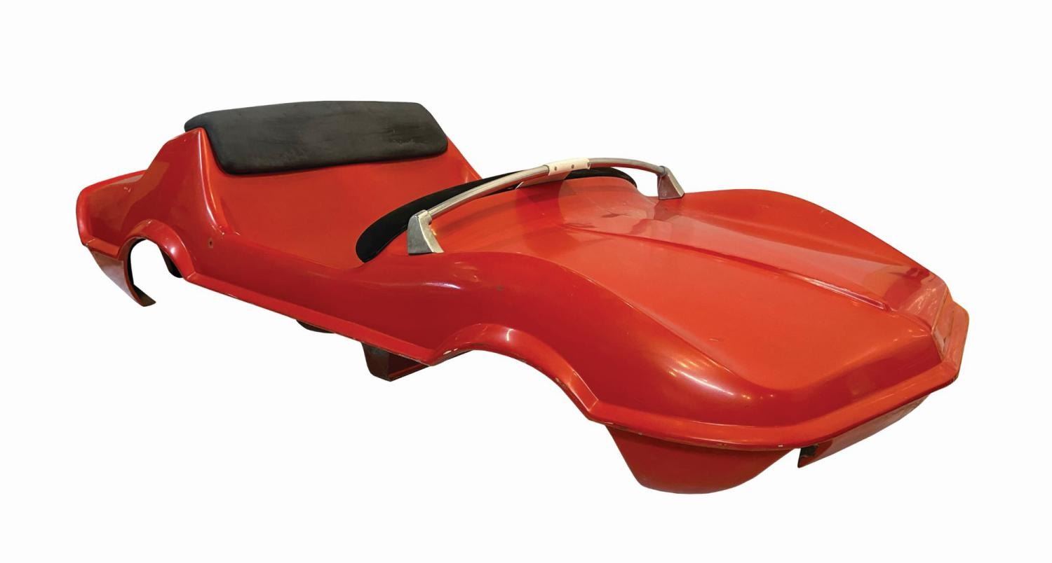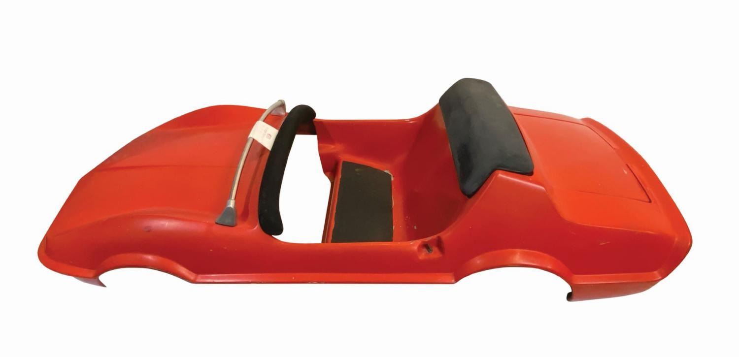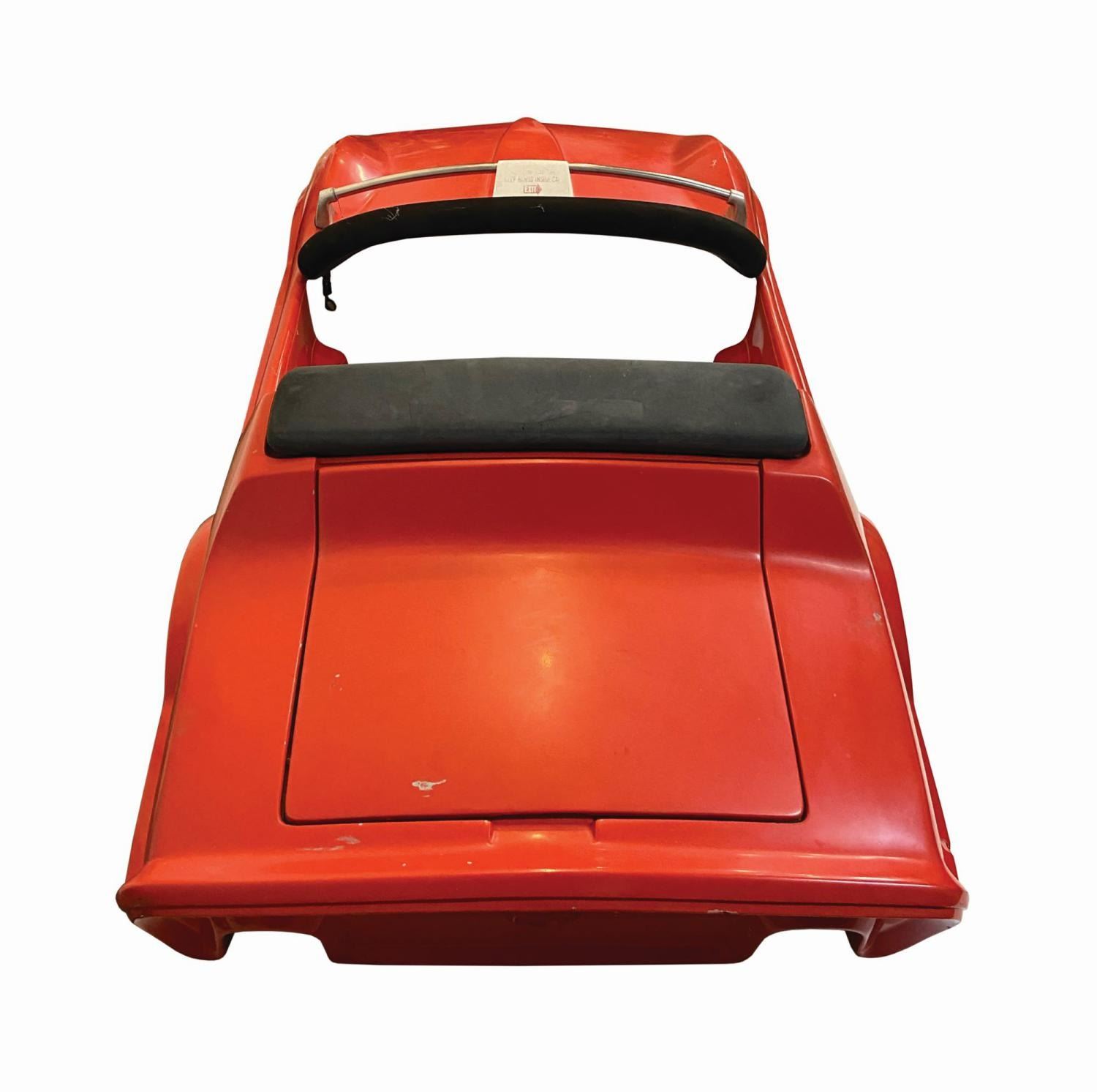 (Disneyland, 1967-1999) An original red vehicle body from the Autopia attraction in Disneyland. This original fiberglass body was used on the Mark VII style vehicles which were in service from 1967 until 1999. These iconic vehicles were designed by legendary Imagineer Bob Gurr, and their sleek angular shape and vivid colors have made them very sought-after by collectors and hobbyists today. Finding an original vehicle body unrestored such as this has become very difficult. The body measures approximately 9.5ft long, 4ft wide, and 2.5ft tall. It is in good park-used condition, with some scuffing, scratches, and spots of paint wear throughout from its park use and removal. This vehicle has not been restored and retains its original paint, body, padding, and metal grip bar, just as guests would have experienced this vehicle within the attraction. This item may require special shipping arrangements, please inquire for details and estimates.