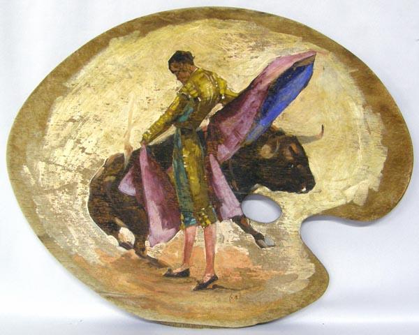 Original Matador Painting On Artist Pallet. Artist pallet is wood, very dry, some cracking. Measures approx. 15'' x 19''. Buyers Pay Actual Shipping and Handling Charges(see terms and conditions for more information)