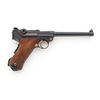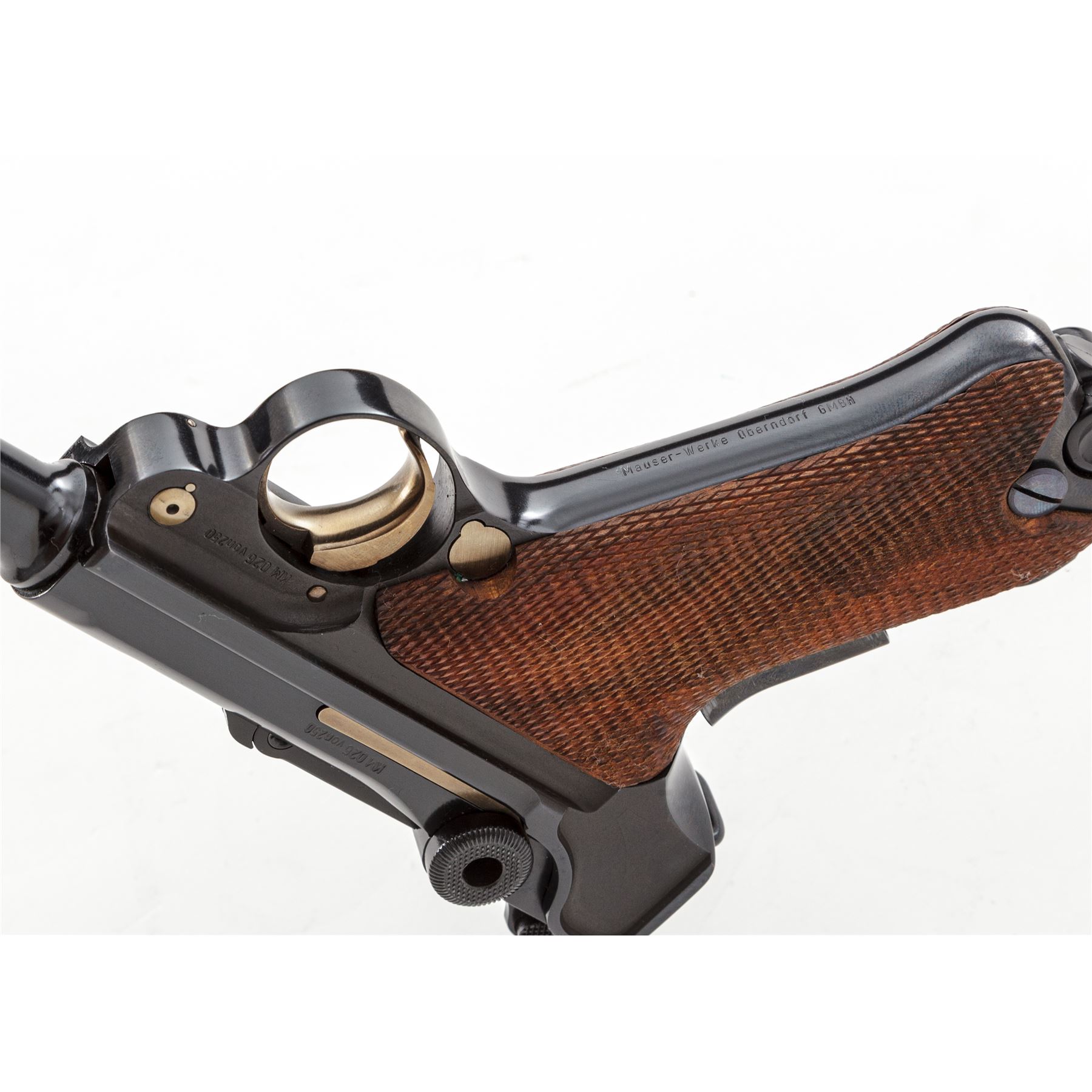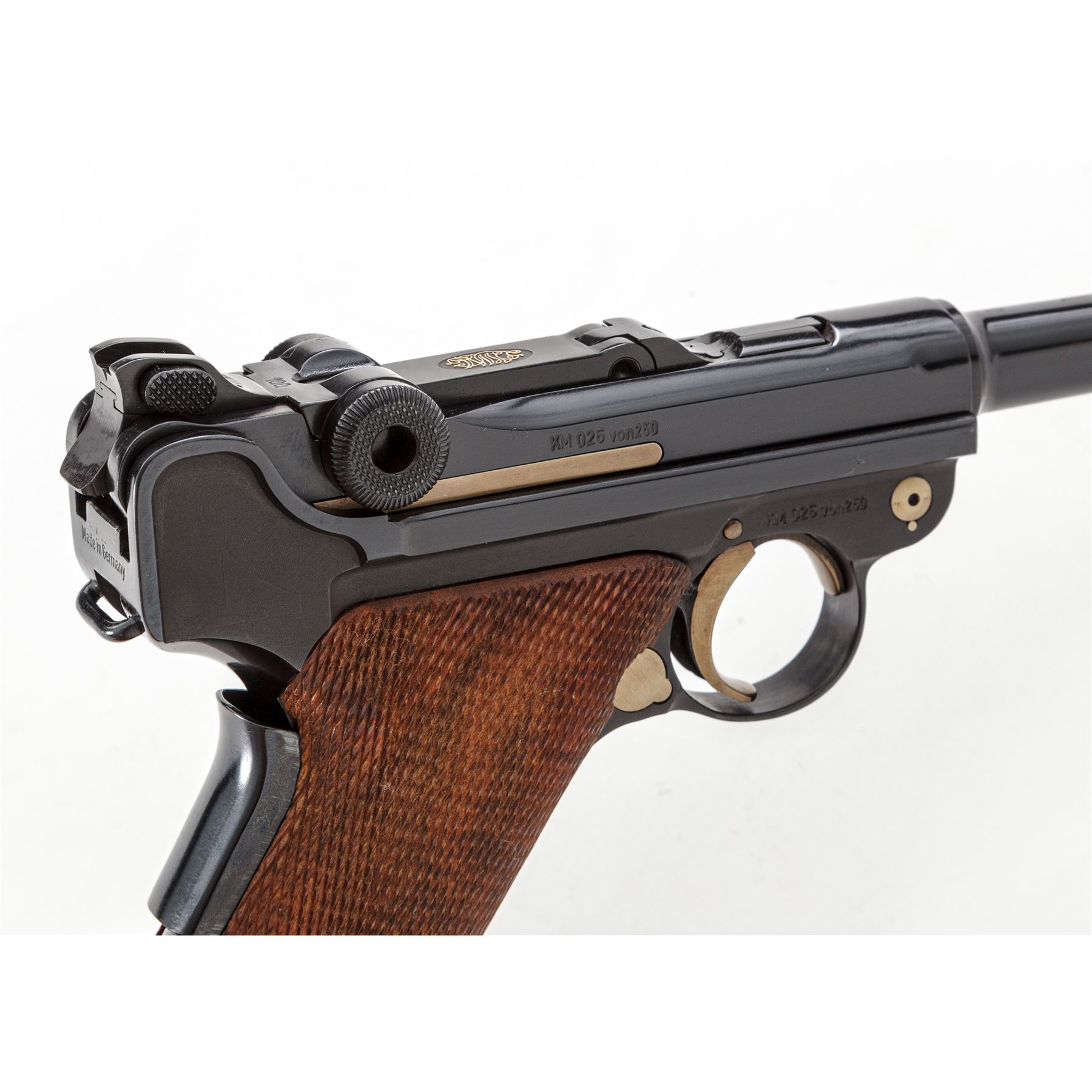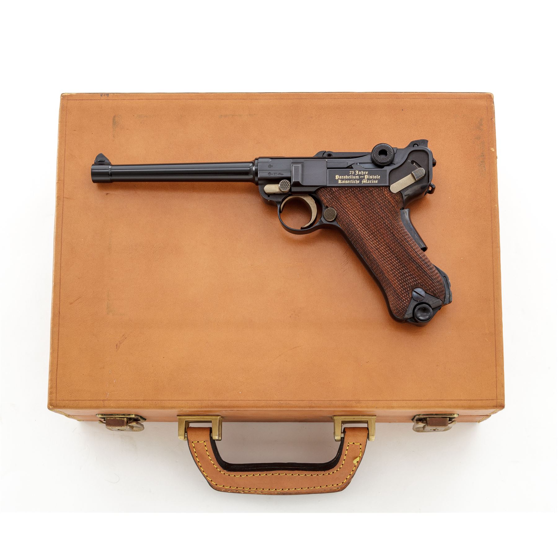 Original Mauser 75th Year Commemorative Naval Luger, #KM025von250, 9mm, 6'' barrel, royal blue finish with gold accents, checkered walnut grips, two (2) modern magazines, cleaning rod, combo tool, instructions, and test target, in factory fitted luggage-type case. Mfg'd in the early 1980s by Mauser to commemorate the 75th Anniversary of the 1906 Naval Luger. Complete with two-position adjustable rear sight, grip and thumb safety, gold DWM logo on central toggle link, as well as ''75 Jahre/Parabellum-Pistole/Kaiserliche Marine'' in gold to left side of lower frame. Condition is excellent, appearing as new and unfired. Upper partition of the case interior has come loose and can be easily repaired. Exterior of case with just minor soiling. Est.: $2,500-$3,500. (C&R/PPT)
