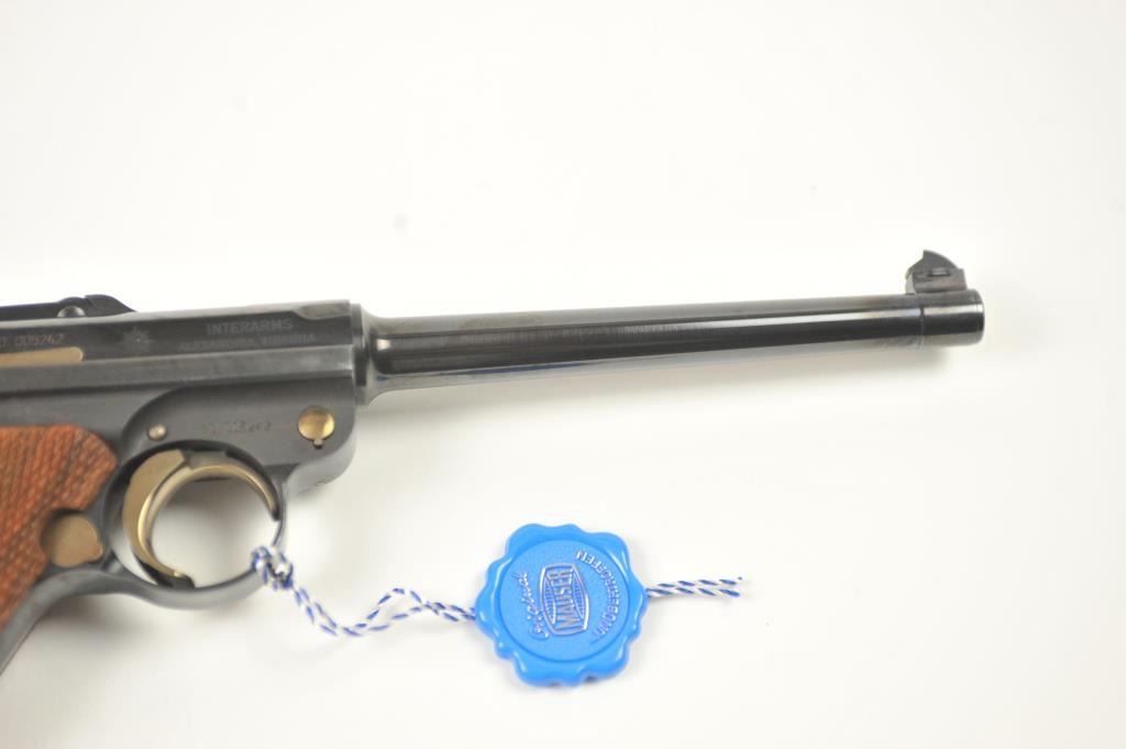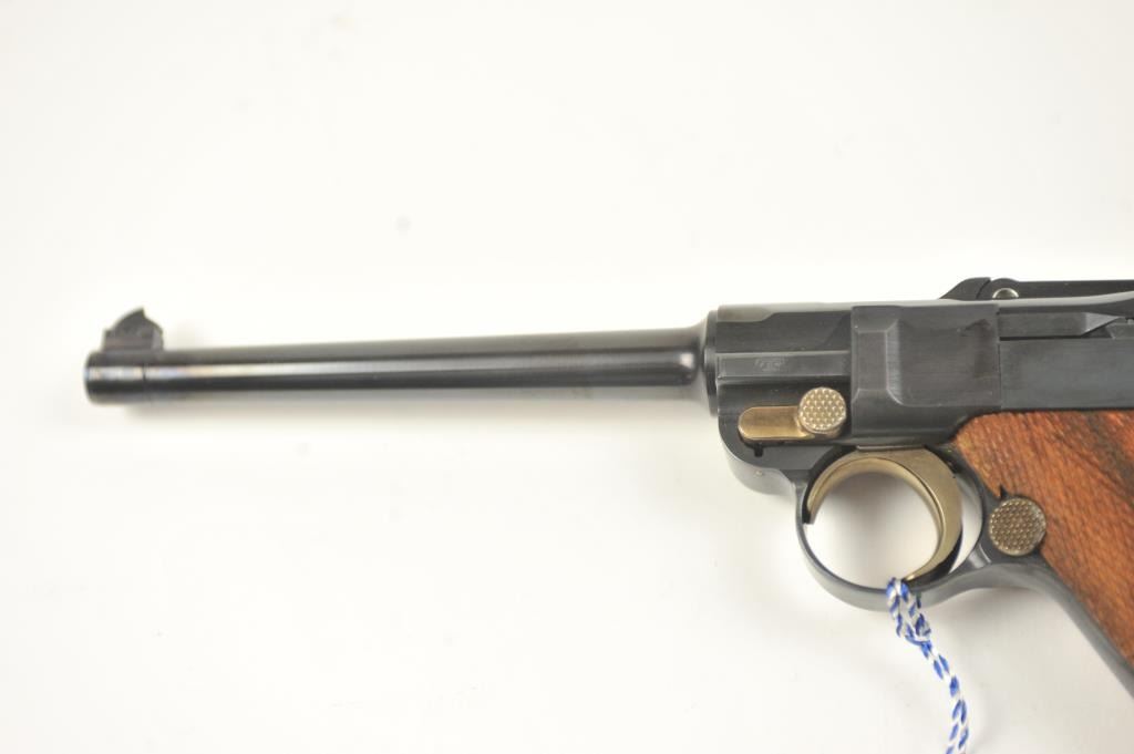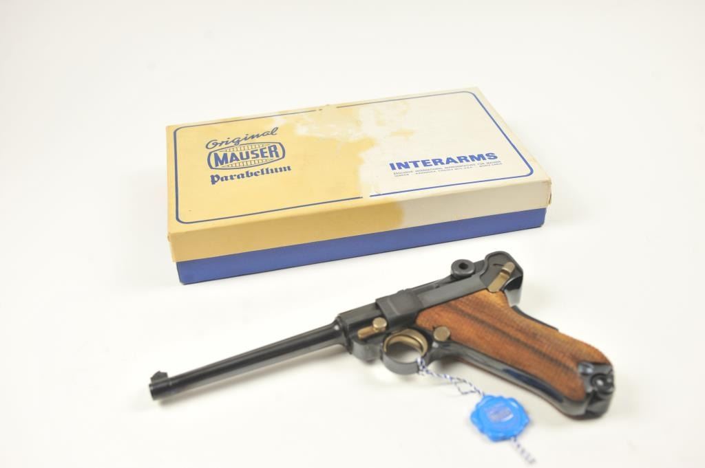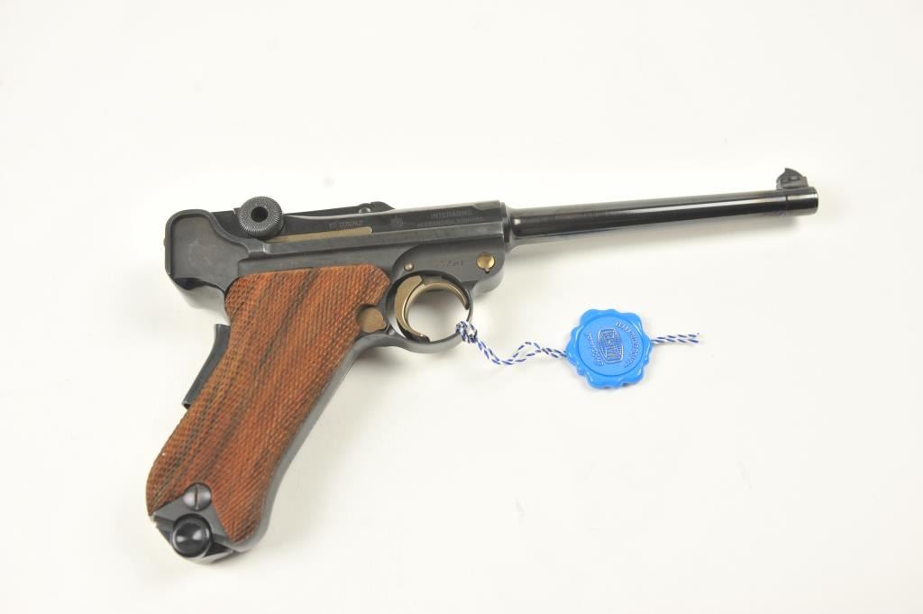 Original Mauser Oberdorf American Eagle Series Luger in .30 caliber with a 6” barrel, made in 1970s, like new in box, S/N 5242. Note: consecutive number at lot 150 this auction. In box with target extra mag,cleaning rod and takedown tool. Near mint 99%+ to new. No evidence of firing since leaving the factory. The box shows oil staining and tatters. (Modern/PPT) Est.: $900-$1800