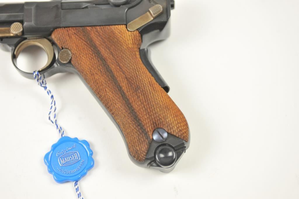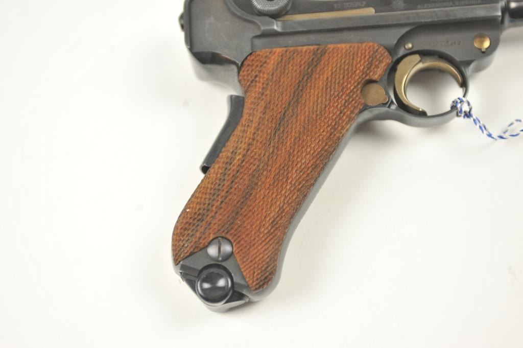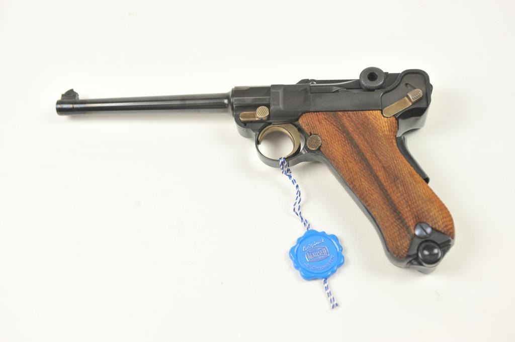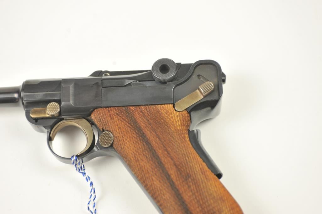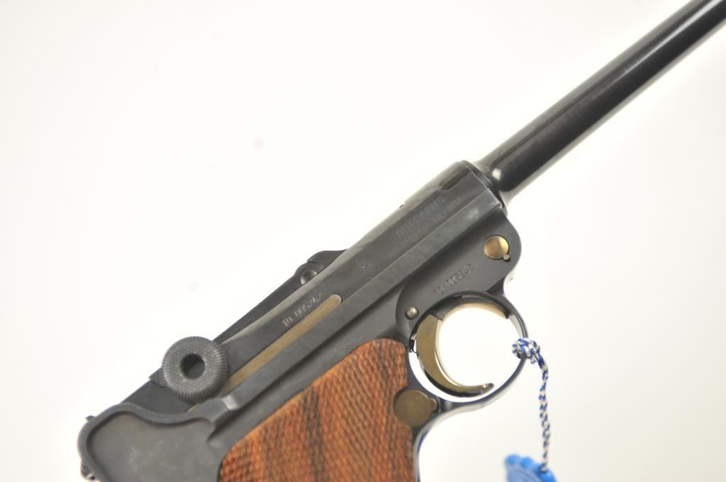 Original Mauser Oberdorf American Eagle Series Luger in .30 caliber with a 6” barrel, made in 1970s, like new in box, S/N 5242. Note: consecutive number at lot 150 this auction. In box with target extra mag,cleaning rod and takedown tool. Near mint 99%+ to new. No evidence of firing since leaving the factory. The box shows oil staining and tatters. (Modern/PPT) Est.: $900-$1800