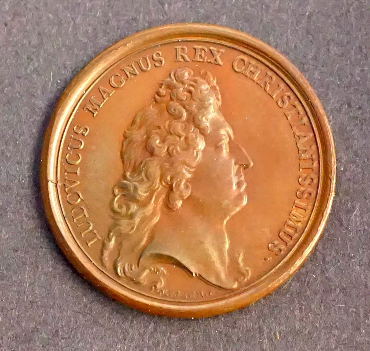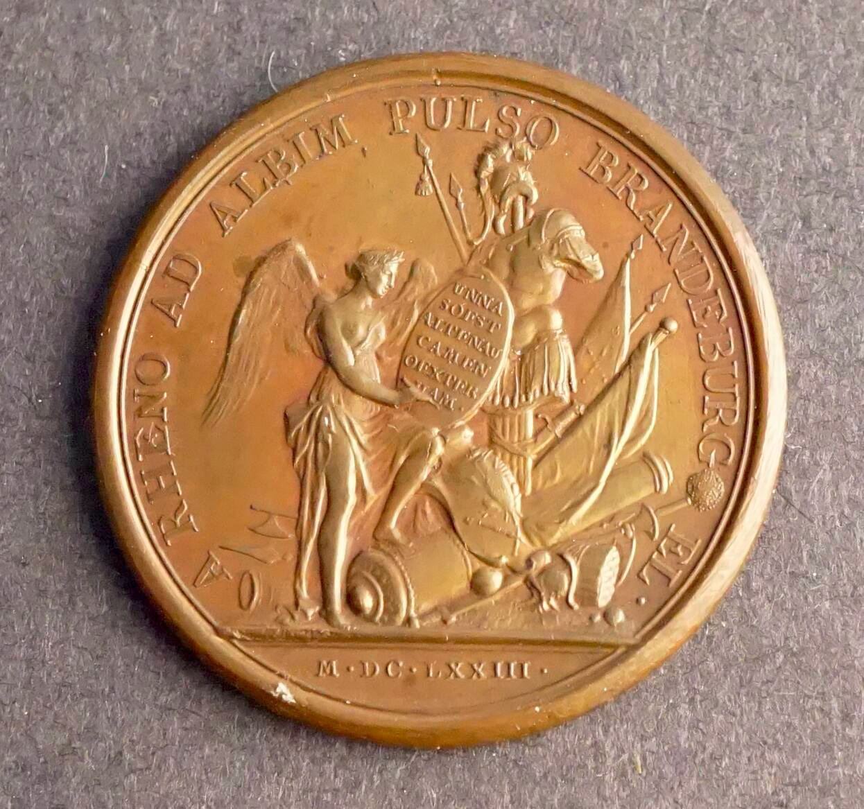 LUDOVICUS MAGNUS REX CHRISTIANISSIMUS Bust, right. Below: signed P. MAUGER F. Reverse: Victory, foot on cannon, inscribing tablet that leans on arms. A RHENNO AT ALBIM PULSO BRANDEBURG EL In exergue: Date M.DC.LXXIII (1673). AU-UNC. 41mm, 30.6 grams.