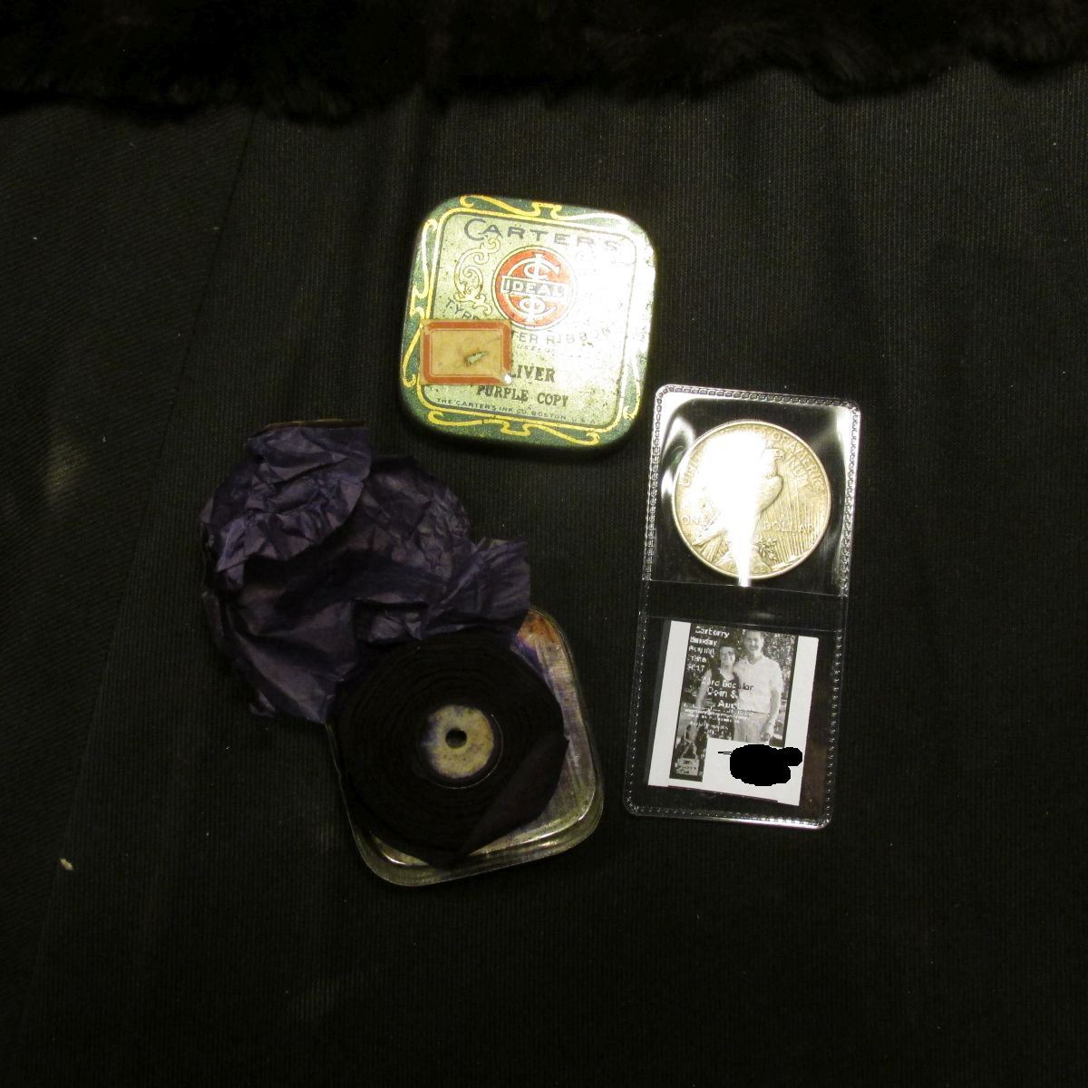 Original Metal Tin "Carter's Typewriter Ribbon…Purple Copy" & 1926 D U.S. Peace Silver Dollar, Fine.