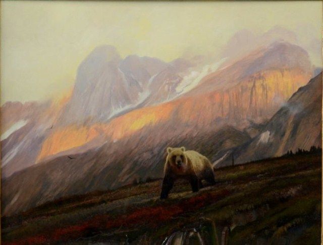 Original Michael Coleman oil painting signed on lower right corner, measures 26” x 30” image only, showing golden coated bear in high mountains; beautifully framed and painted in 2011. Michael Coleman is ourfavorite contemporary wildlife artist and we were involved with the creation and publication of his new book “On Eagles Wings”, a perspective authored by Peter Hasserick, former Curator of the Buffalo Bill Museum and noted expert. A signed copy of this collector edition will be included for the successful bidder; Coleman has won the “Prix de West” and numerous prestigious Gold Medals and Art awards. He has woncompetitions for Federal Stamps including National Parks Service Award for “Yellowstone Park”. His works hang in major art collections and museums throughout the West; paintings of this size are retail priced from $16,000-$18,000 on the collectors market. Est.: $6,000-$12,000.