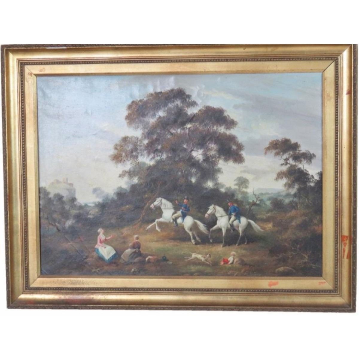 Nice, mid Century signed landscape scene with French cavalry officers approaching a castle. 19" H x 27 1/4" W. Frame: 26"H X 34" W. This painting was museum re-lined, stretched. Frame appropriate.
