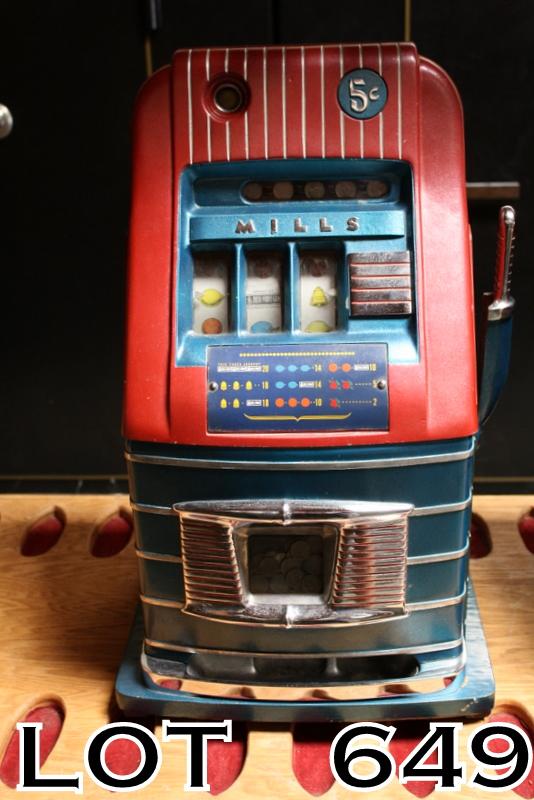 Original Mills high-top $0.05 slot machine circa 1939 with wood sides in very good to near fine original condition. Working, with key. Est: $1,250 - $2,500
