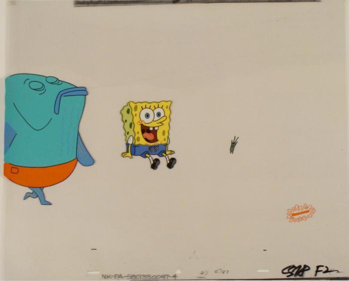 To create production cels, the original animator's drawing is transferred onto an acetate cel (by hand-inking and/or photo copying). The cel is then hand-painted on the reverse side. The cel is ready to be matted and framed. It has the animator's notations at the bottom of the cels. The cel has multi-layers: first is Spongebob, next is a green bystander, and then Plankton. There is the Nickelodeon logo at the bottom right of the second cel.