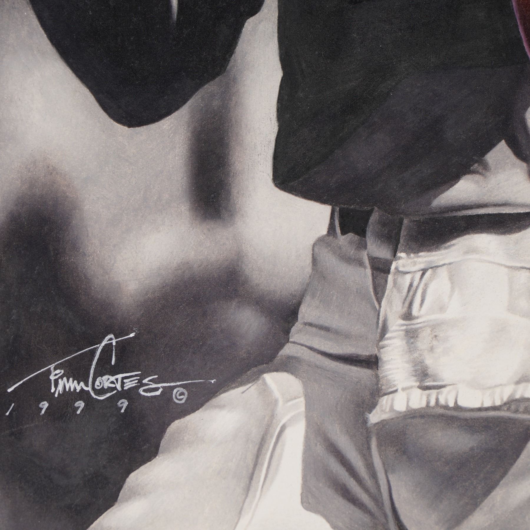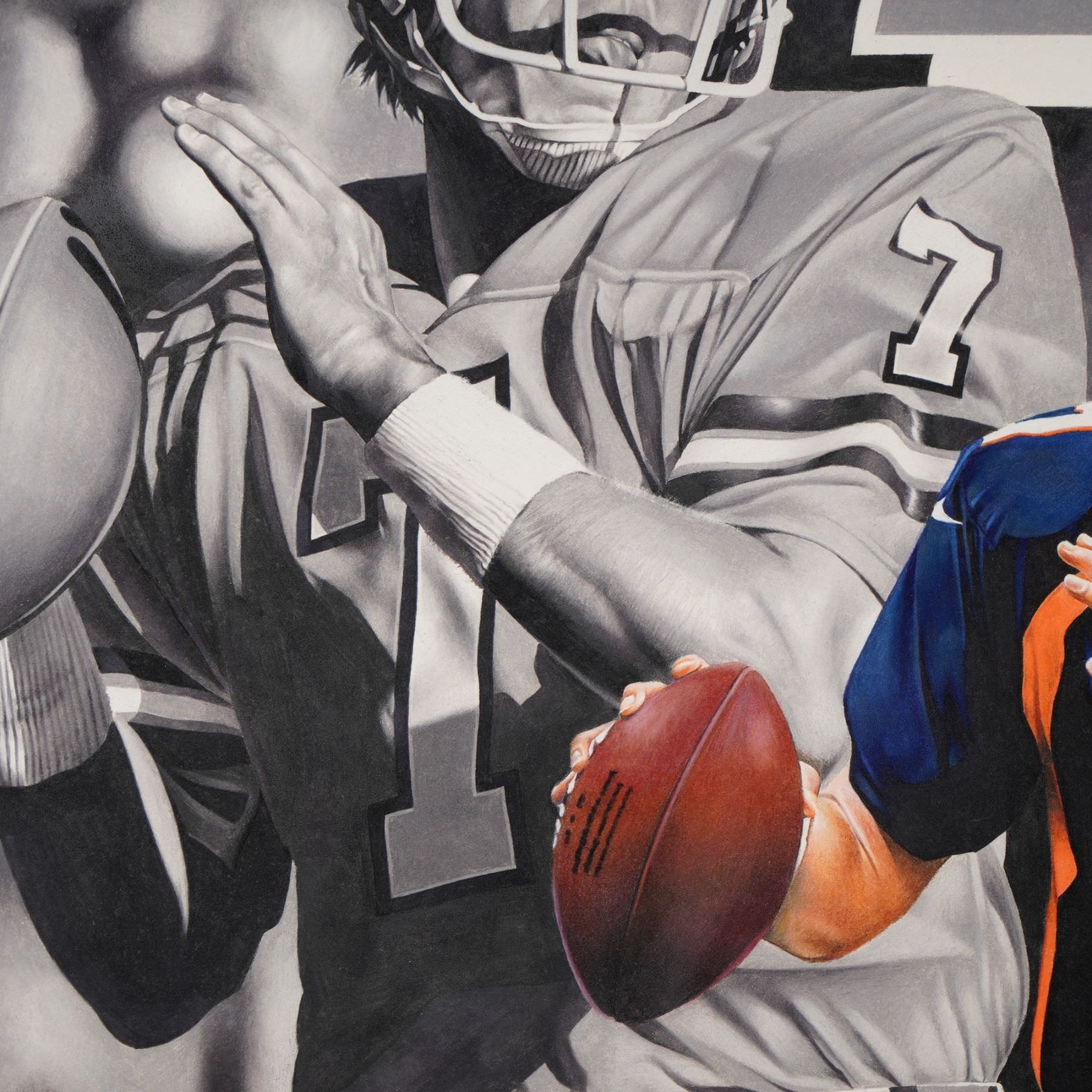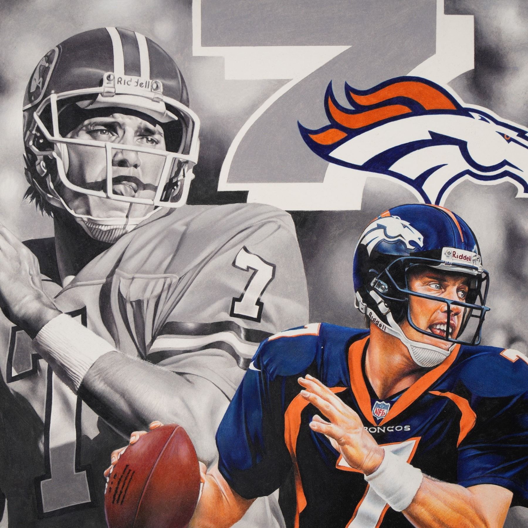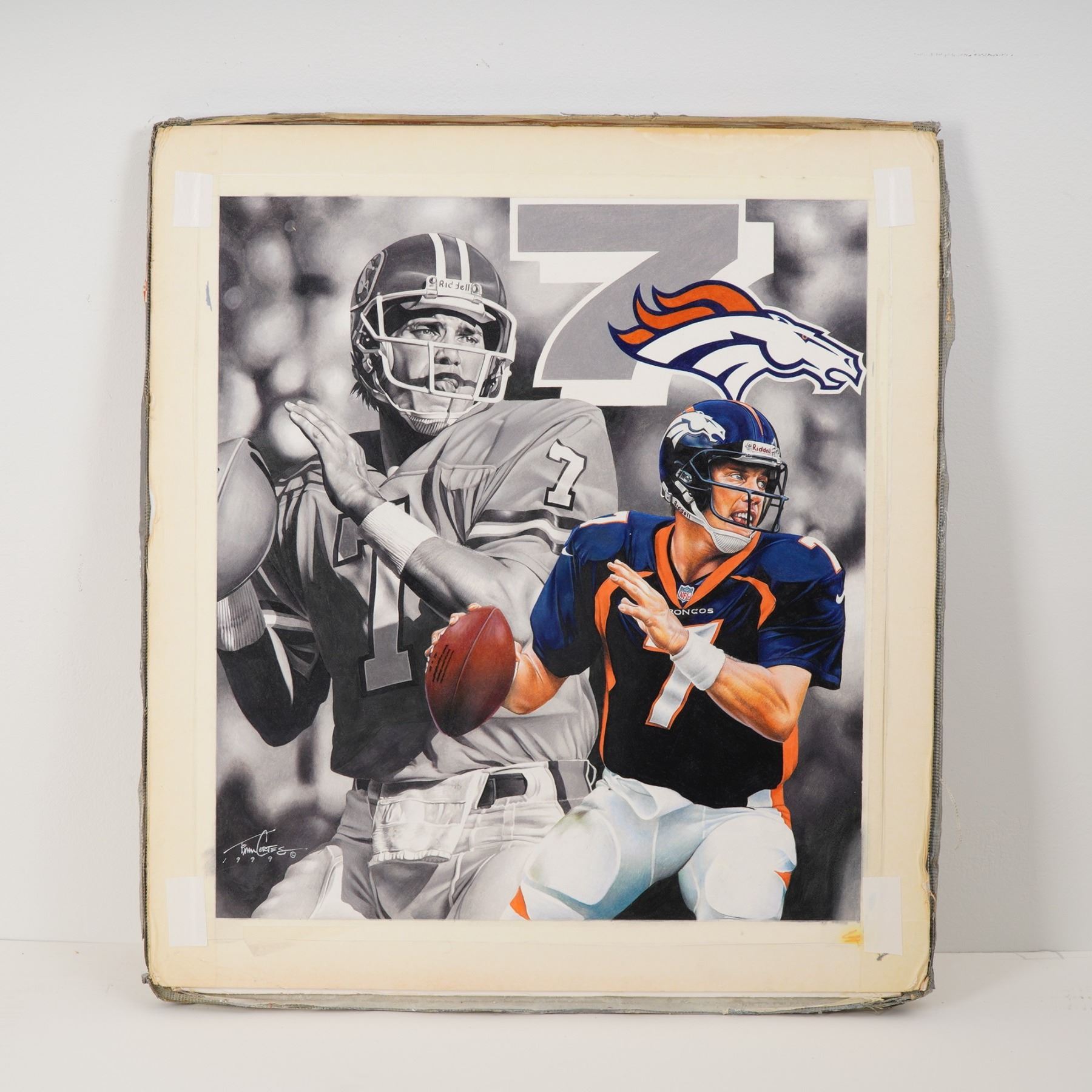 Dynamic original mixed media color drawing by celebrated sports artist Tim Cortes, signed and dated 1999. This striking composition in color pencils and markers with a spray varnish features Denver Broncos quarterback legend John Elway in both vintage and modern depictions, blending black-and-white realism with vibrant team colors. The artwork prominently showcases Elway's iconic number 7 and the Denver Broncos logo, capturing the energy and legacy of one of football's greatest players. Signed and dated by the artist in the lower left.
