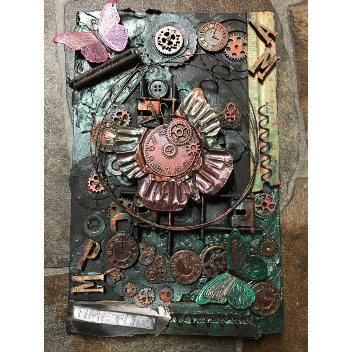 Original mixed media painting on panel, created by California artist Gloria Jean in 2019. using metal & wooden components. "Time Flies". 11" L X 7" W. Signed on the reverse by the artist.