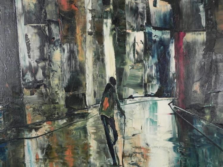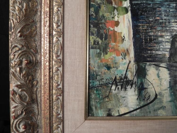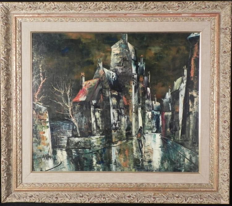 A man with a cane walks down an empty, rainy street in this intriguing original painting. The colors are blended beautifully, portraying the wet scene, and the old the buildings show their age. Artist: Signed, lower leftDate: 1960, marked 60, lower left Medium: Acrylic on canvasImage size: 21 x 17 1/2 inchesFraming: In decorative antique style frame, with gold inner border, and beige silk matte areaFrame size: 25 x 28 1/2 inchesCondition: Excellent; minor nicks to the frame