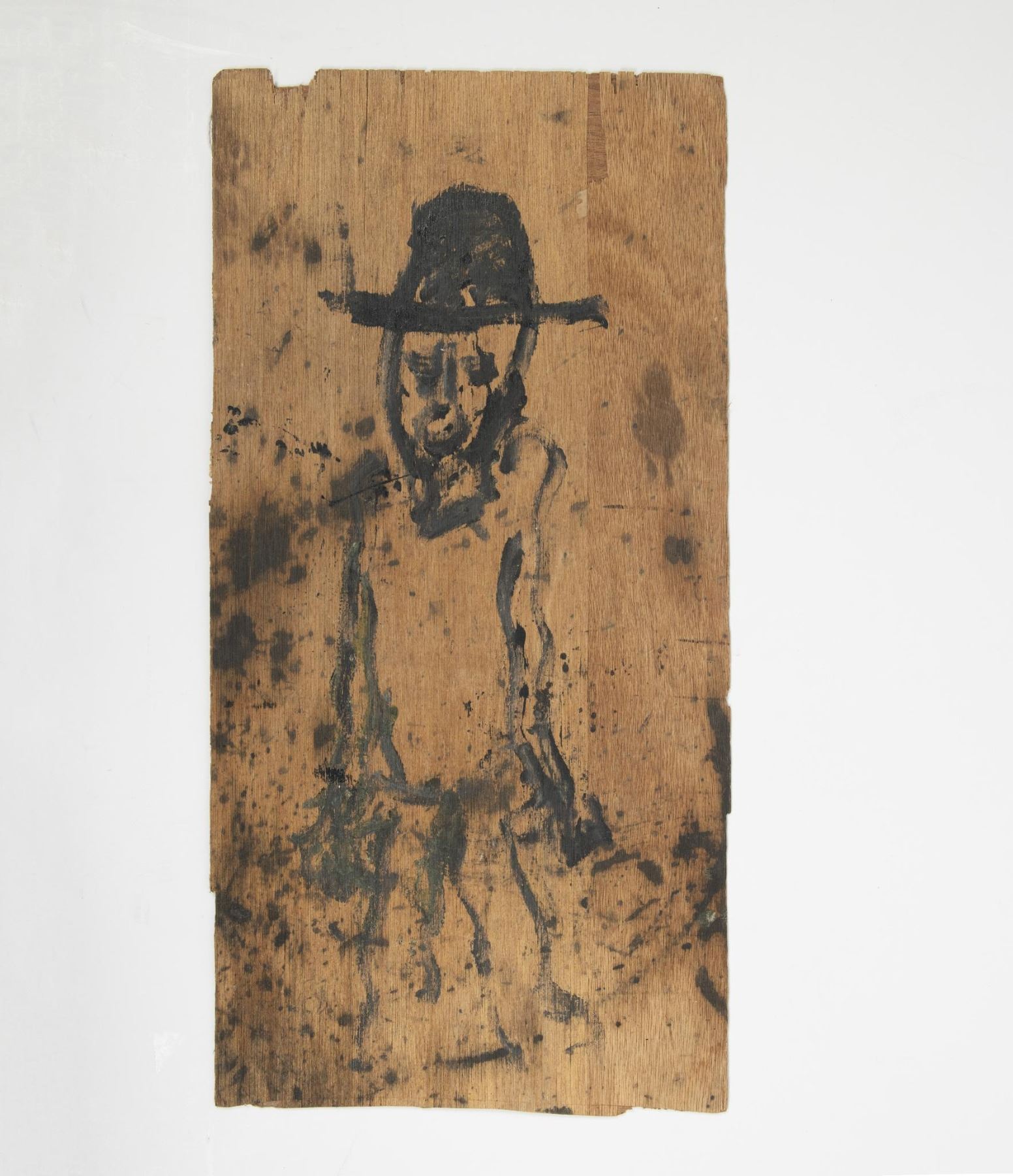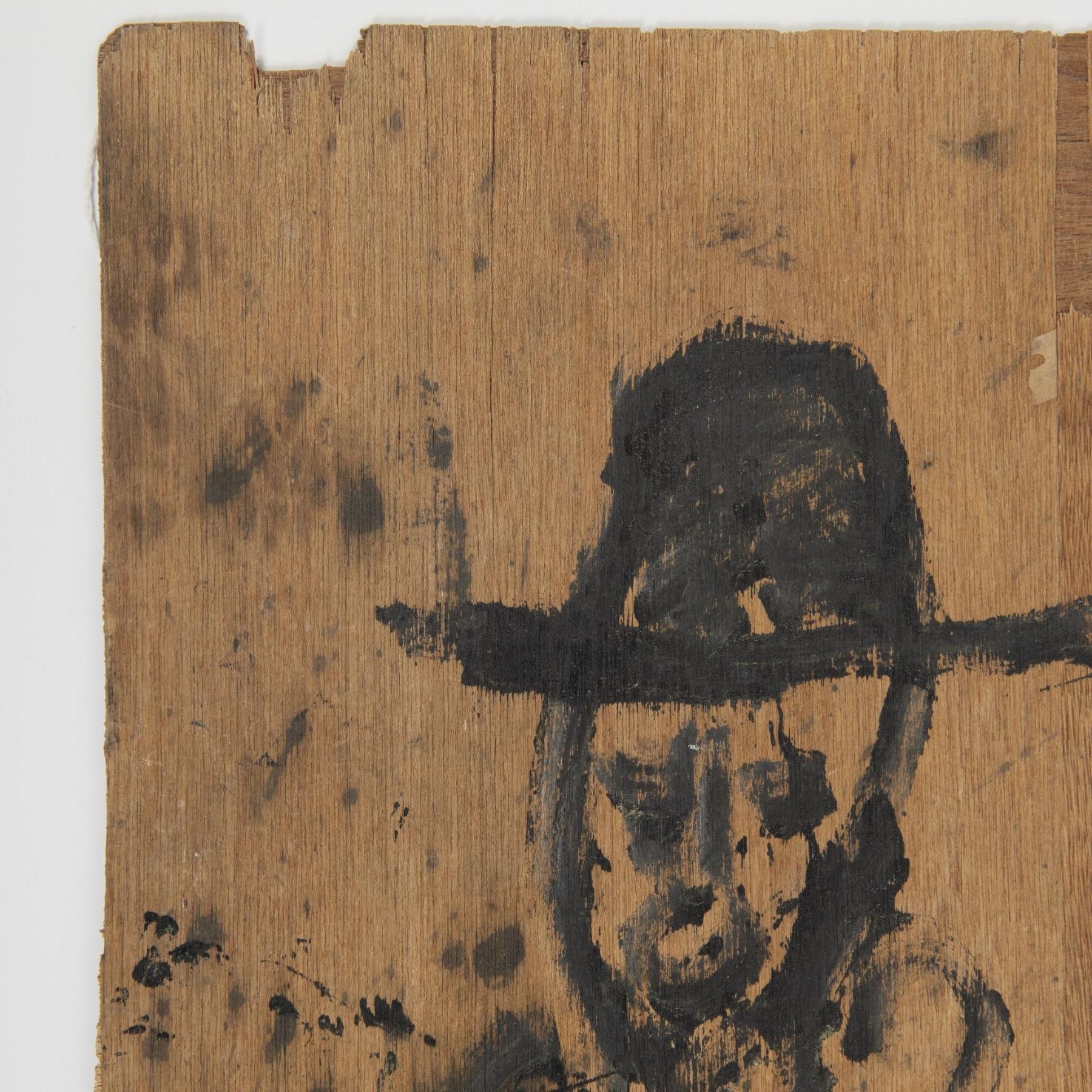 Original monochrome oil on wood board that depicts a male figure with a wide brim hat painted in an Expressionist style with black lines and drips.