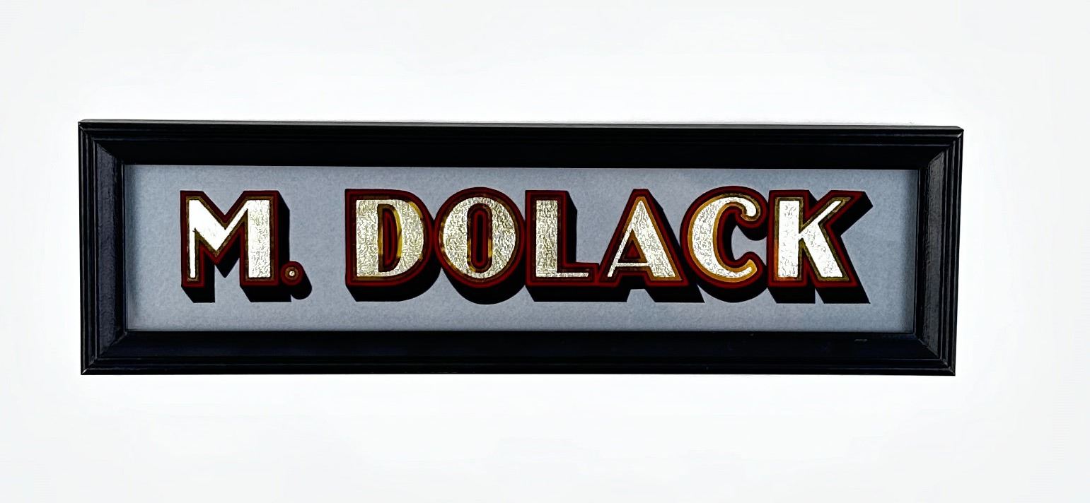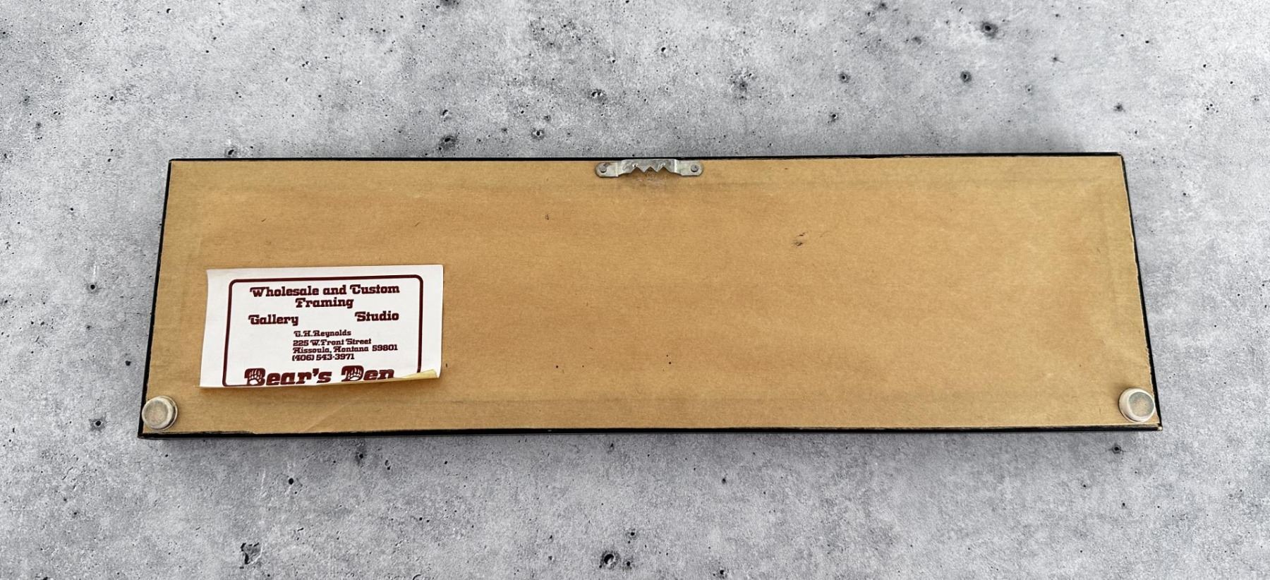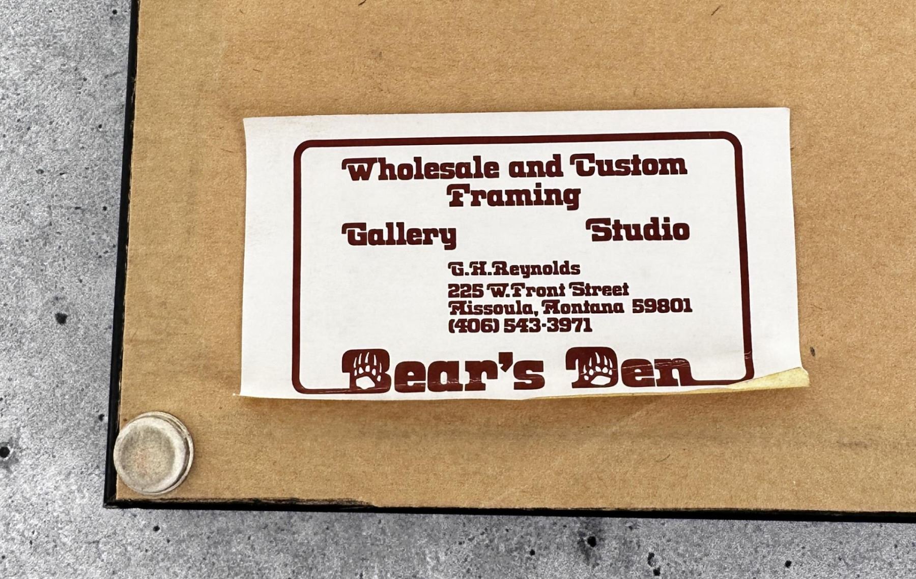 Monte Dolack Reverse Painted Glass Studio Sign. This is the original sign that hung in Monte's Original Studio. 15" by 4 1/4". Monte Dolack (Born 1950) is active/lives in Montana. Monte Dolack is known for Poster illustration, landscape and wildlife painting. A native of Great Falls, Monte Dolack grew up surrounded by the same sweeping vistas and big sky that inspired Charlie Russell. His love of Montana and passion for the West's diverse landscapes and wildlife are evident in the images he creates and the commissions he undertakes. After studying art at Montana State University and The University of Montana, Monte opened his first studio in 1974, beginning a career in fine art and graphics. His best known early works - wild animals wreaking havoc in human homes - comprise his Invaders Series, exploring the myths of the West and how we view our relationship with our environment. The irresistible appeal of these images helped build Monte's national reputation and continues to attract collectors. Monte has been the recipient of a number of prestigious awards in the course of his career, and his work is part of the collection of the Library of Congress, the American Association of Museums, the National Wildfire Foundation and numerous other museums and corporations. Recent exhibitions include The Montana Exhibition, Manawatu Art Museum, New Zealand; Artists of the American West, Bank of Ireland Arts Centre, Dublin, Ireland, and The Kumamoto Prefectural Art Museum, Kumamoto, Japan. Monte's work was chosen to be included in The North American Print Biennial, Boston, MA and New American Paintings, a Western States competition sponsored by the Open Studio Press as well as five major museums in China including the National Art Museum of Bejing, as part of the New West Exhibition. In 2011 he exhibited at the Palace of Nations at the United Nations, Geneva Switzerland. He was selected at the turn of the century by the Missoulian as one of the 100 most influential Montanans of the twentieth century and recently received the distinguished Fine Arts Alumni Award from the University of Montana along with his wife, Mary Beth Percival. A love of the natural world, combined with his exuberant curiosity and travel experiences, has shaped the content of Monte's imagery. Blending mythology, technology and elements from nature, his work is infused with a sense of humor and irony. Monte's keen interest in environmental issues has lead to commissions for the Nature Conservancy, Defenders of Wildlife and Trout Unlimited as well as over 200 posters and prints for various organizations. In addition to his acrylic, oil and watercolor painting, Monte continues to pursue his interest in traditional printmaking, having created numerous original lithographs. Since 1993, with his wife, Mary Beth Percival and staff, he operates a flourishing gallery in downtown Missoula. Monte and Mary Beth have traveled extensively in the US, Europe, Mexico, New Zealand and Japan, visiting important cultural sites and museums and making paintings from their travels.