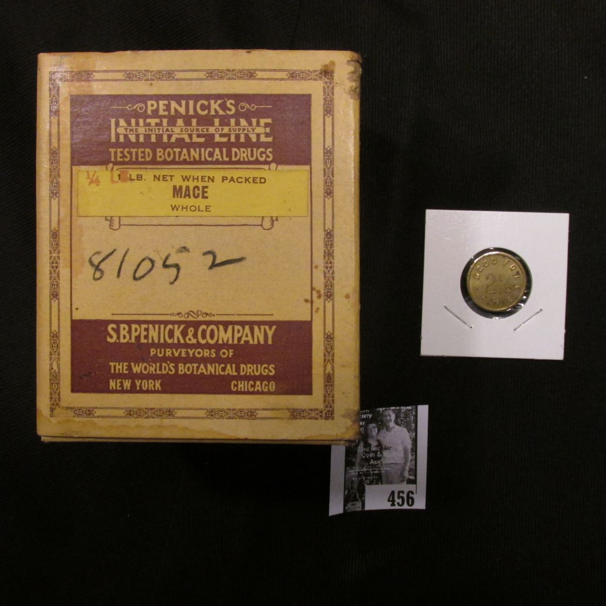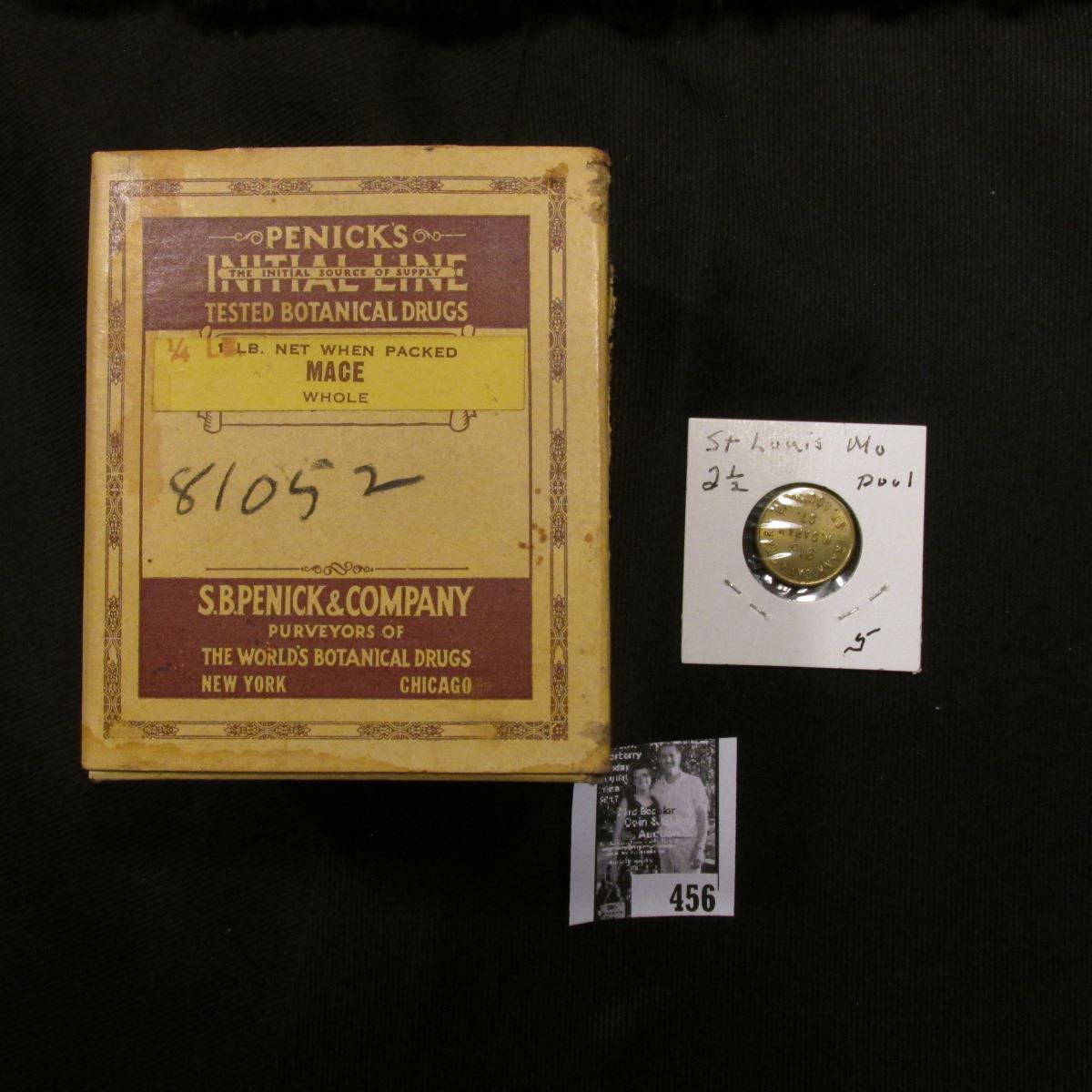 Original Mouse Eaten box "Penick's Initial Line Tested Botanical Drugs Mace Whole" by S.B. Penick & Company; & "Good For/2 1/2/Cents", "Frank Cavagnaro/916/N.Sarah/St./St. Louis, Mo.", rd., Br., BU.