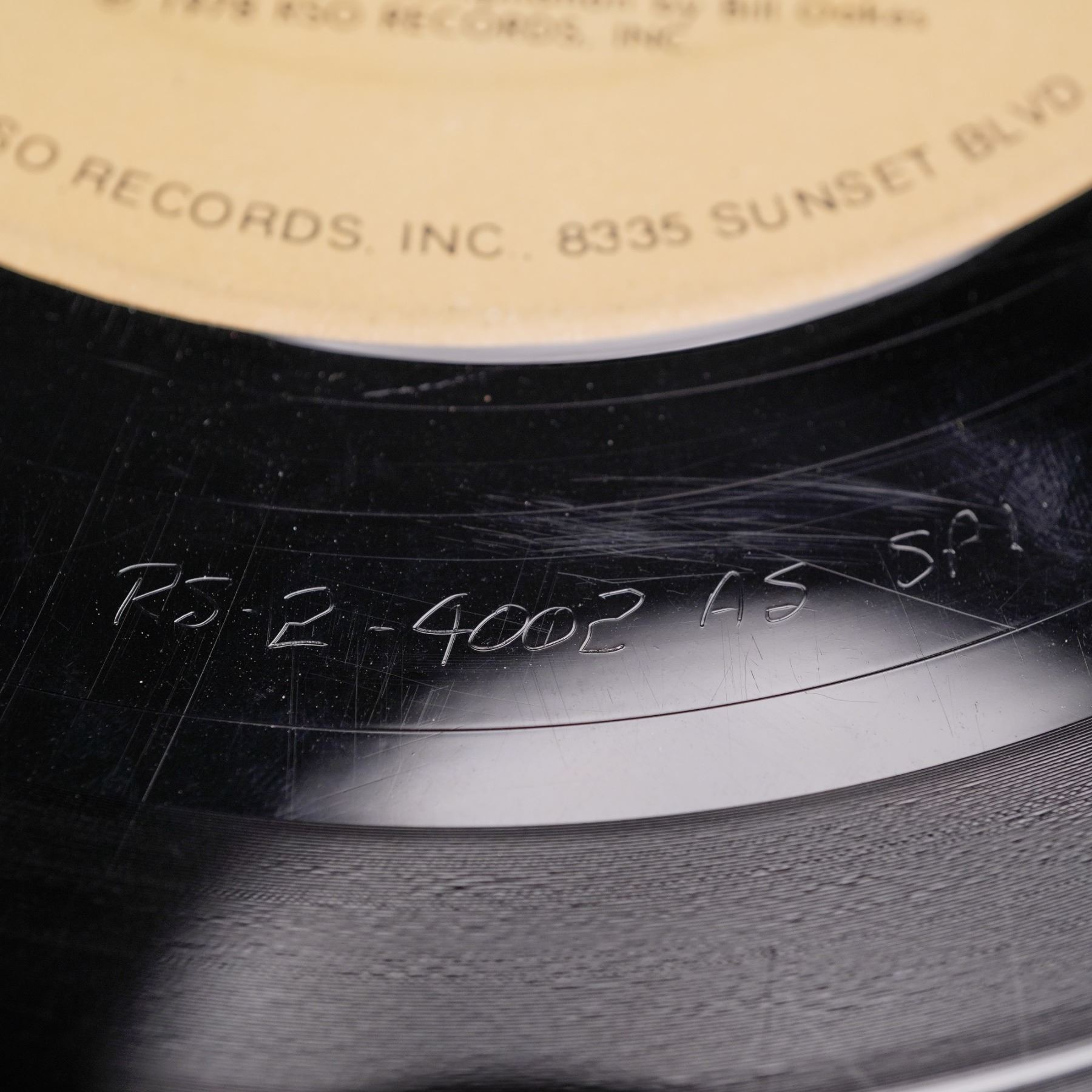 A two record set pressed on the tan RSO label. The front shows the classic photo of the Grease cover art, while the back displays a lively Welcome to Rydell High cast group shot. Includes songs such as Grease, Youre the One That I Want, Summer Nights, and Hopelessly Devoted to You. Comes with a middle page featuring extra photos and credits to complete this iconic movie soundtrack presentation.