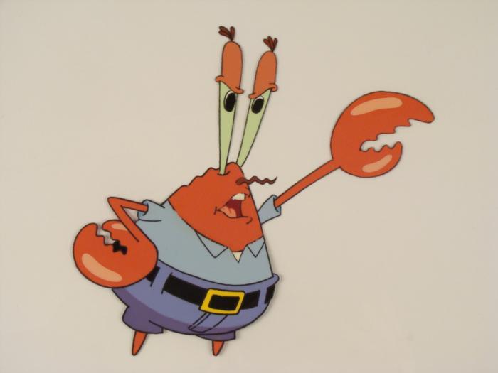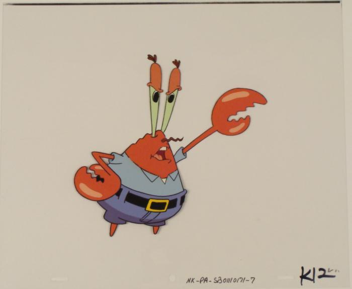 This original animation cel is from the Nickelodeon TV show SpongeBob Squarepants. The story takes place under the deep blue sea in Bikini Bottom, where SpongeBob resides. SpongeBob, who is a yellow, porous sponge, is your typical happy-go-lucky character, as he is always cheerful and enjoys making people laugh. Patrick Star, SpongeBob's neighbor who is a starfish, is your average children's show idiot, as he boasts knowing nothing and is often getting himself into ridiculous situations. Between the homes of these two lies the home of the miserable Squidward, a squid, who is known for being grouchy and playing tricks on SpongeBob and Patrick. Both SpongeBob and Squidward work at the Krusty Krab, a fast food business run by the greedy money-loving Mr. Krabs, a crab, the arch rival of the evil, possibly misunderstood, Plankton. Another neighbor, Sandy Cheeks, an athletic squirrel who normally wears an astronaut's space suit, was introduced in "Tea at the Treedome." She spends most of her time inventing and experimenting. Mr. Krabs has his claw up. Original Production Animated Cel Overall Size of Cel: 10 1/2" x 12 1/2" Very Good ConditionThis is an original hand-painted cel set-up used in the production of an episode of "SpongeBob SquarePants." Each one-of-a-kind set-up represents a slight change in position of the characters. When individually photographed and projected in rapid succession, the images appear to move.