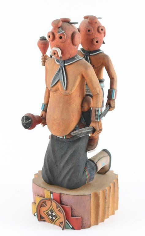 By unknown artist, depicting two figure mud heads, with hand carved wood base. Measures 10x5.5.