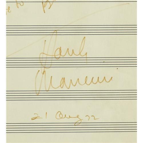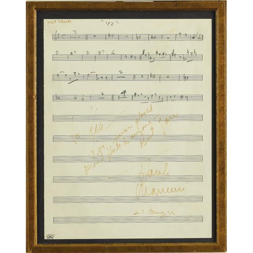 <B>Original Music Manuscript Signed by Henry Mancini to Kaye Ballard.</B></I> Four Oscars, 20 Grammys, two Emmys, Moon River, The Pink Panther Theme -- all the creations of Henry Mancini, who signed this sheet of music, "To Kay - I've never played second flute to anyone - But you Henry Mancini 21 Aug 72." Matted in an 11" x 14" gold-colored frame. Slight fading of signature, otherwise in Very Fine condition. Desirable form for Mancini (one of the composers honored in 2004 with a $.37 stamp). <I>Accompanied by LOA from PSA/DNA.</B></I><BR><BR><b>Shipping:</b> Other (oversized items, group lo (<a target="_blank" href="http://www.heritageauctions.com/common/shipping.php">view shipping information</a>)