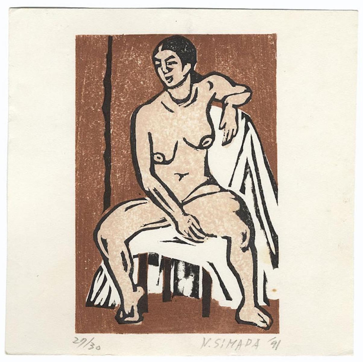 Original N. Simada Japanese Woodblock Print. This print is from a fascinating collection of nude portraits produced by a variety of sosaku hanga artists in 1989 and 1991. Their works, produced expressly for this series, offer a wide variety of perspectives on nudity and the female form. Each limited edition print is pencil signed and numbered. The series title, "Pictures of Spring," is the literal translation of "shunga." This series presents an interesting inversion of the expectations for shunga, the main form of 19th century Japanese erotica, by presenting artful and varied nude portraits without the overt sexual content of 19th century shunga. FINE CONDITION, 7 1/2" x 7 1/2"