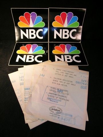 This is a lot of (9) vintage, original peel off NBC stickers that were used to be affixed to NBC vehicles back in the day. Four are black background NBC stickers with colorful peacock logo (measures approx. 10"x10" ea.), and five are stickers with large blue & red 'N' logo and 'NBC' on lower right corner. (measures approx. 11" x 13 1/2")