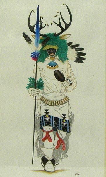 Framed Original Native American Gouache and Watercolor Painting on Paper by P-Y-P of Deer Dancer. Visual measures approx. 14.25''Hx8.25''W. Framed, matted, under glass. SHI $35.