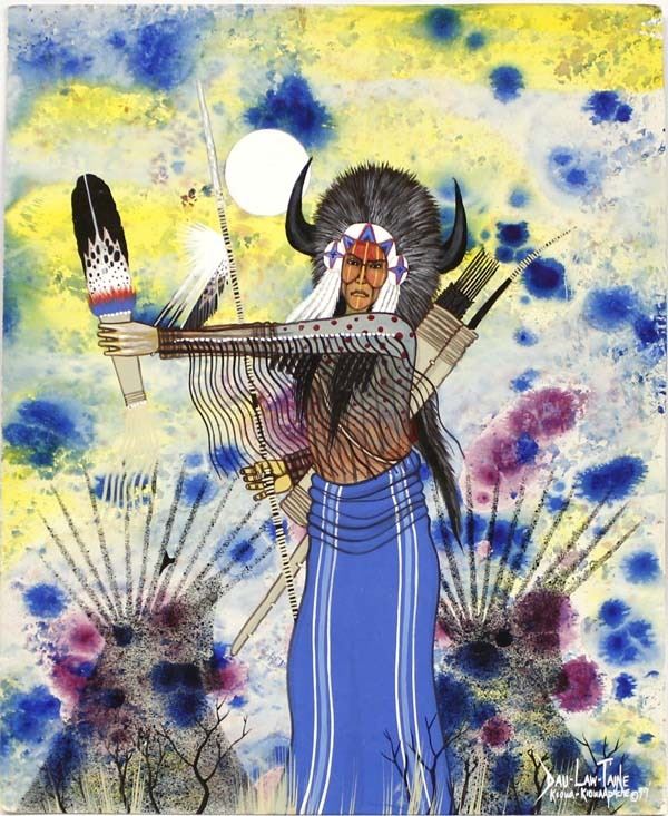 Original Native American Kiowa Apache Watercolor Painting by Dau-Law-Taine (Darwin Tsoodle), measures 19'' x 15.5'', stunning vibrant colors, FYI: "Born in 1964 in the Anadarko, Oklahoma, area and of Kiowa/Kiowa-Apache descent Darwin grew up admiring the work of the old Kiowa masters in the traditional style of painting."