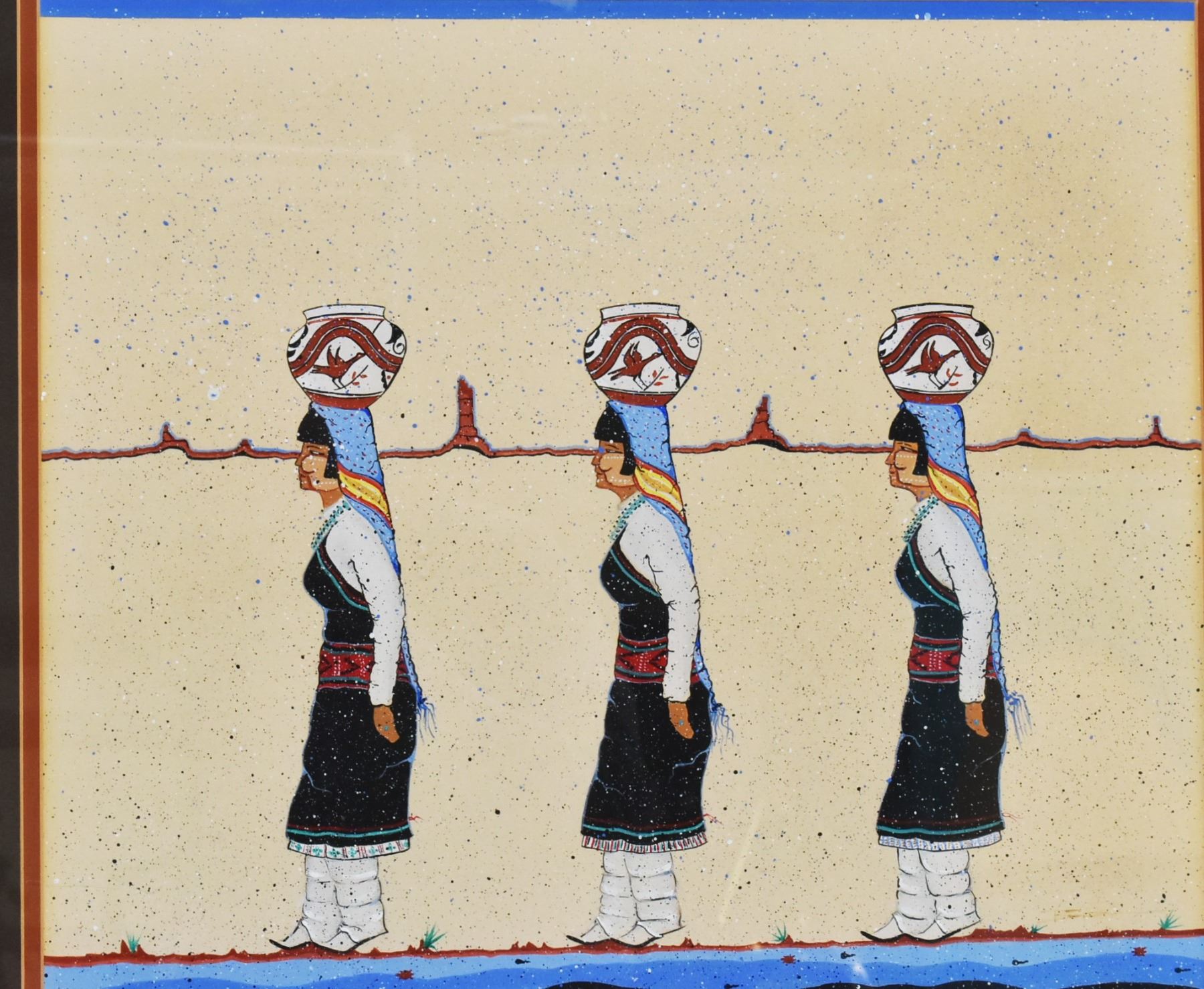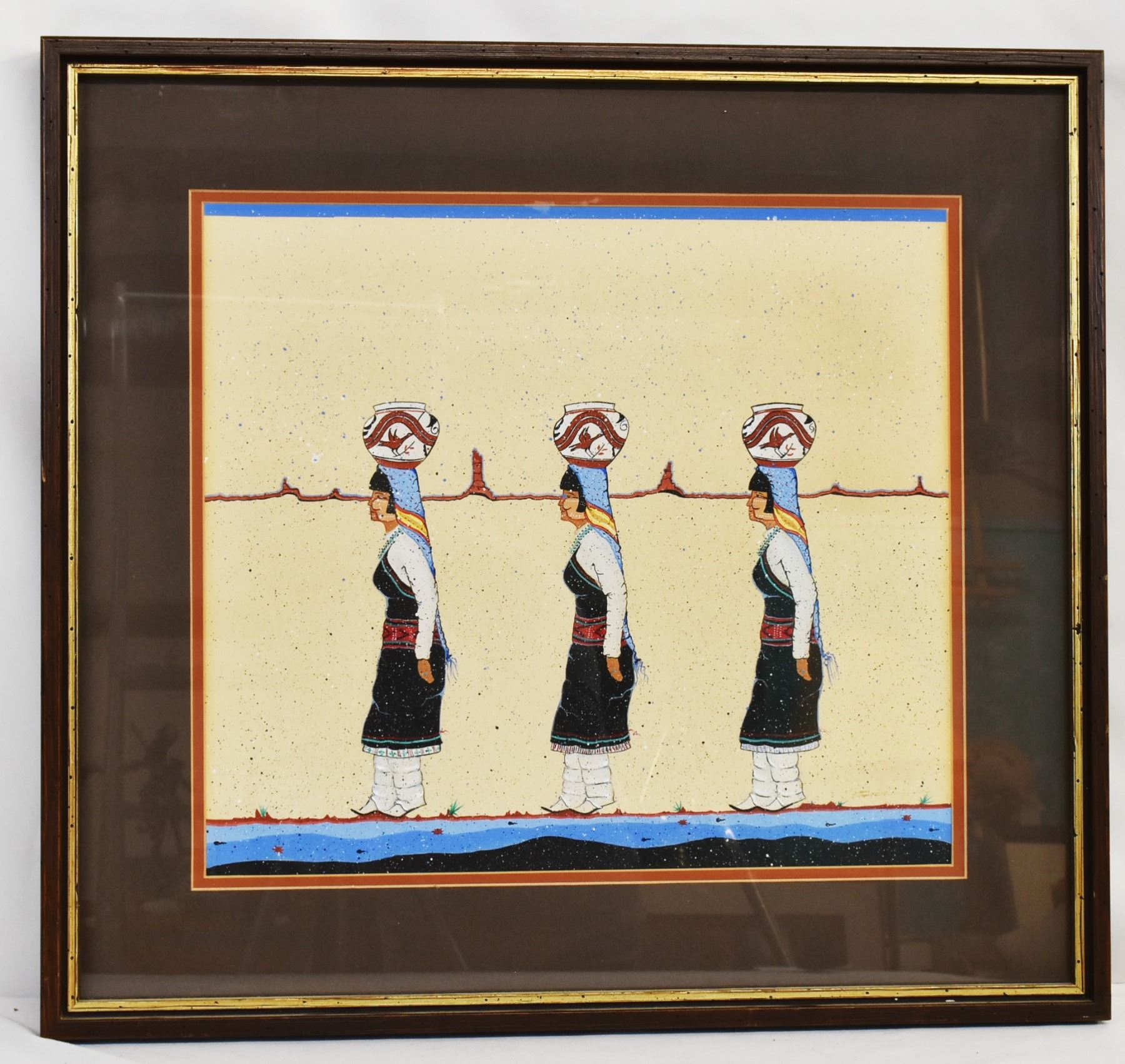 Original Native American Painting, overall framed measurement of 25.25'' x 23.25'', visual measures 15.75'' x 17.75'', professionally framed, double matted, and under glass