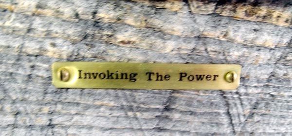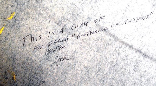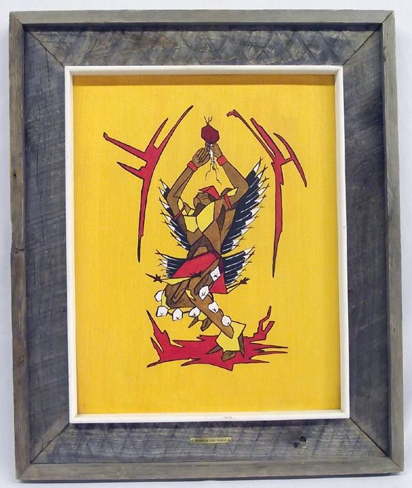 Original Navajo Acrylic ''Invoking the Power'' by JCH, visual measures 16''W x 20''H, w/frame 22.5''W x 26.5''H, great barnwood frame, on back artist has written ''The is a copy of an early 'Gathering of Nations' poster JCH,'' vibrant use of acrylic colors on artist board, placque on bottom ''Invoking the Power''