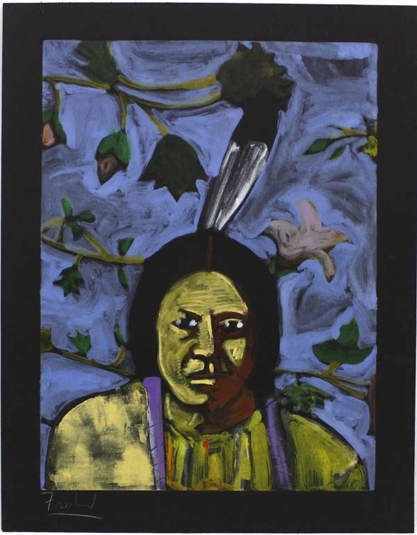 Original Native American Navajo Painting by Aaron Leonard Freeman (American, born in 1965), Monotype with hand applied colored chalk and opaque watercolor on black paper, untitled and signed, measures 24'' x 18'' and can be rolled to ship, FYI: ''Aaron Freeland is an award-winning Dine' (Navajo) artist from Farmington, New Mexico and one of the best pastel artists in the Native American art scene. He produces works in oil (on canvas), monotype, and pastel as well as monotype with hand applied colored chalk and opaque watercolor. Aaron's signature works are oils and pastels painted on black paper, specifically portraying truth through his portraits.''