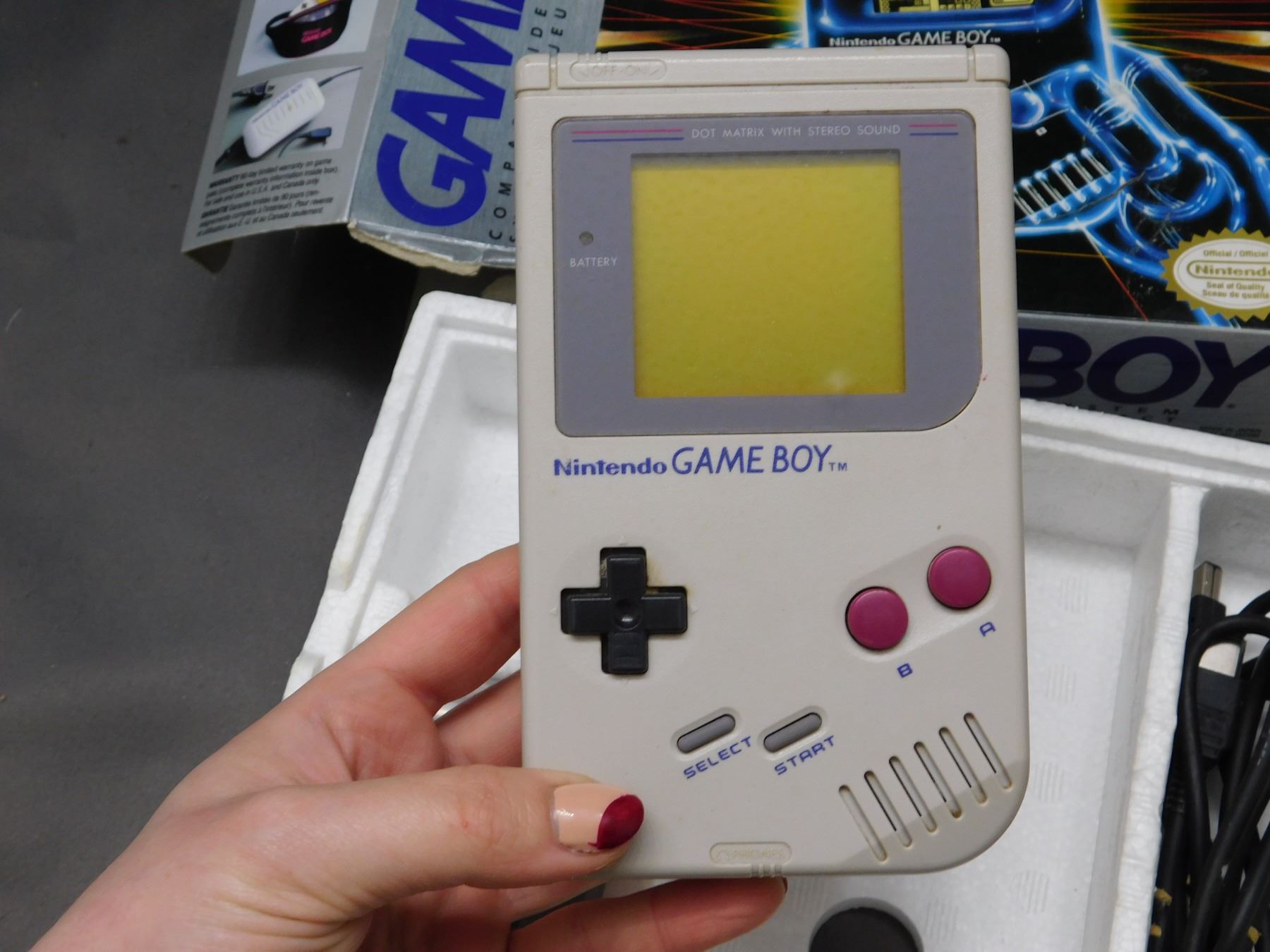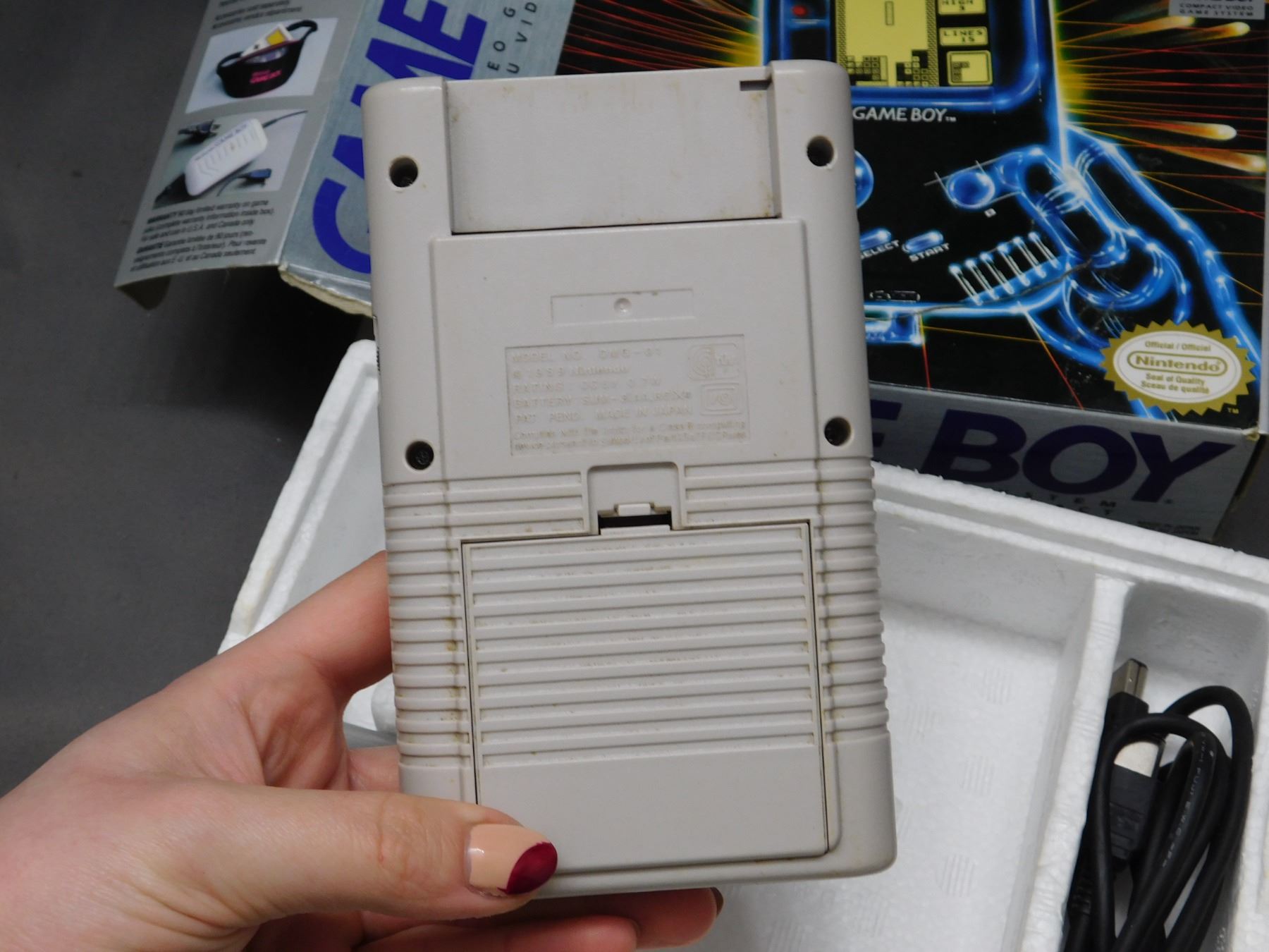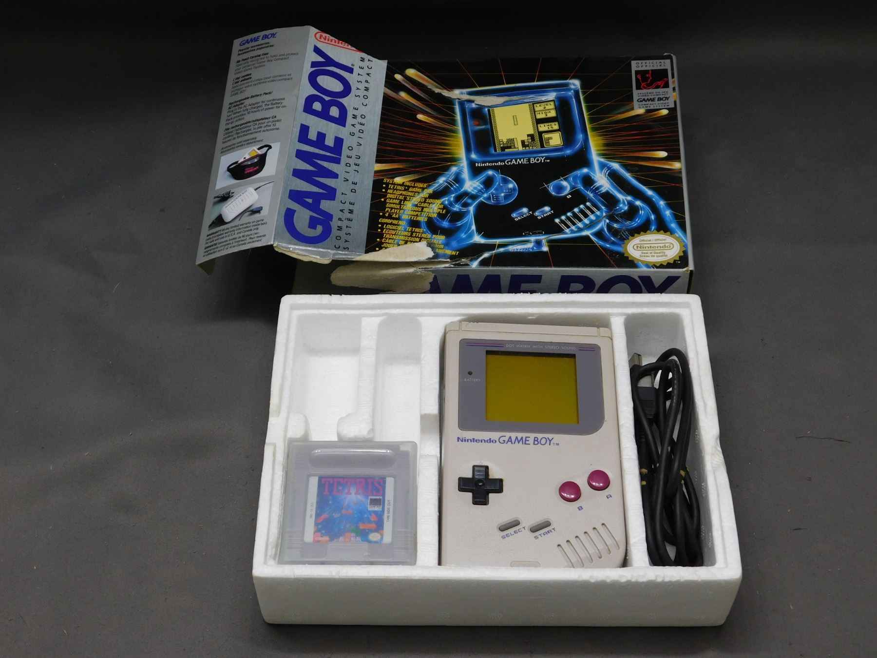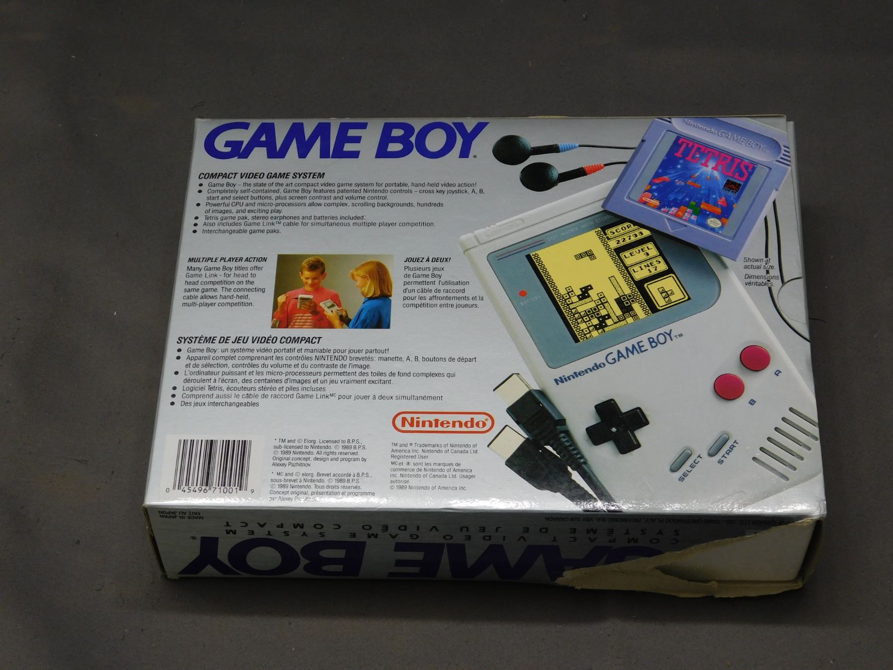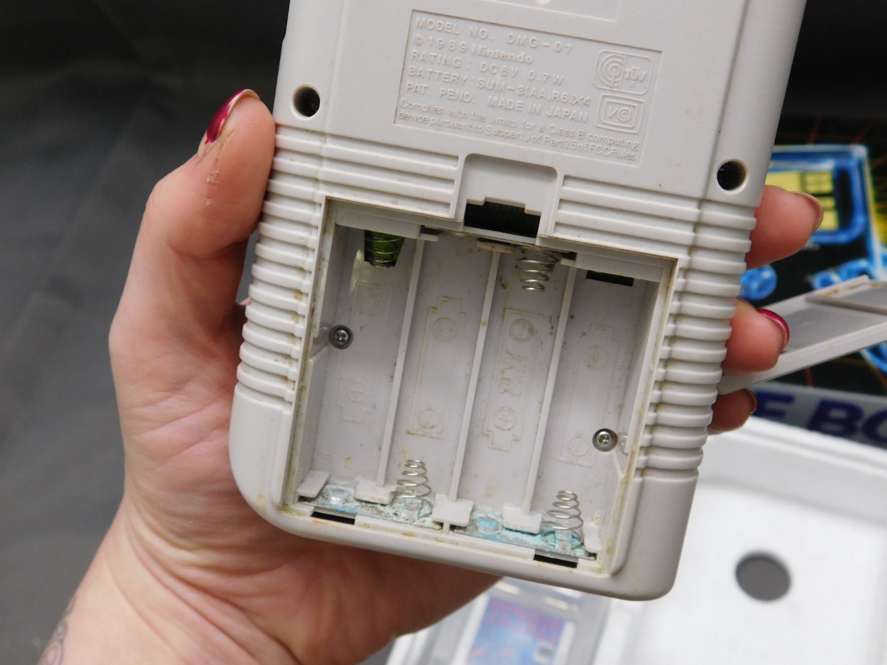 box is torn. comes with Tetris and connector cable. tested works has a couple dead lines. battery compartment has some battery acid.
