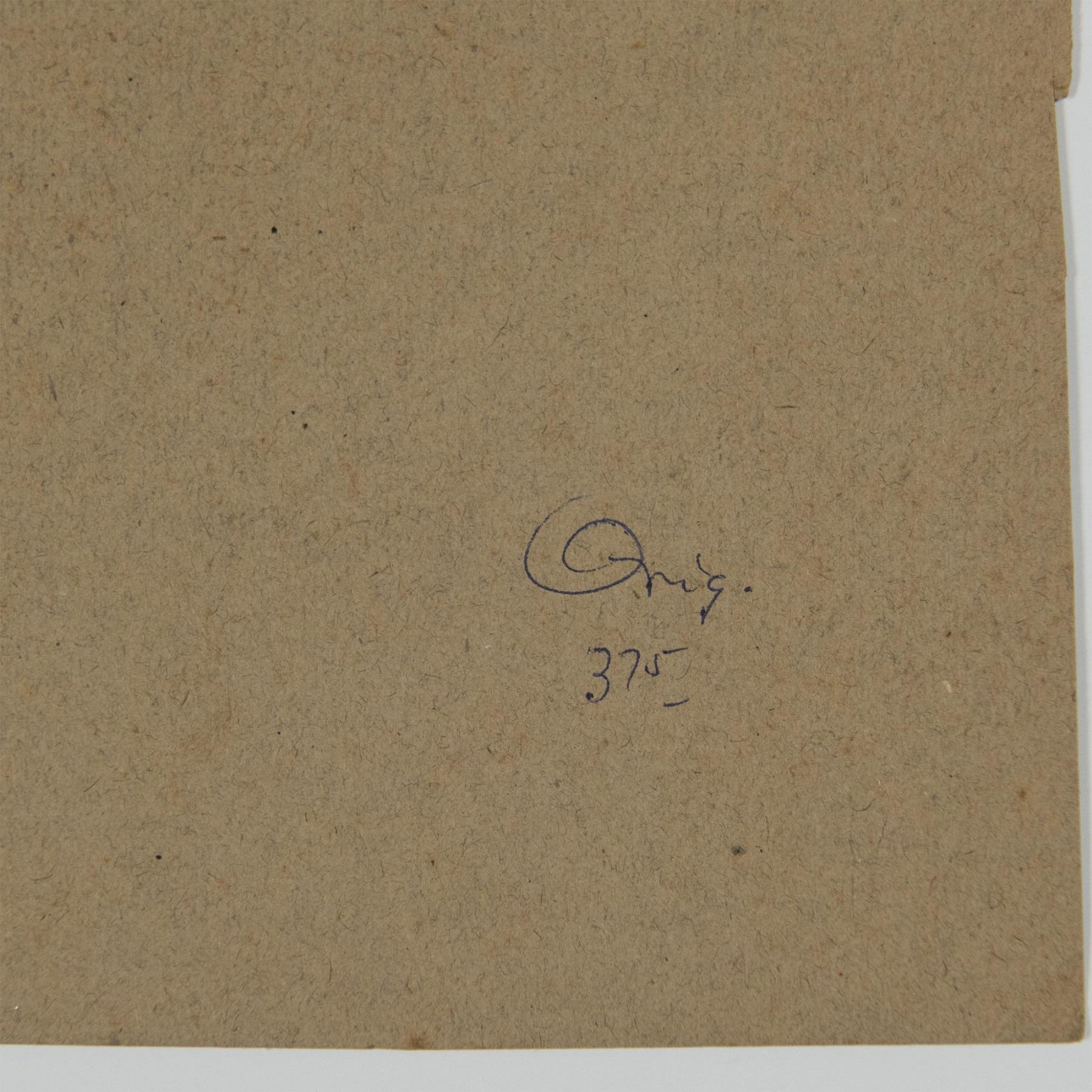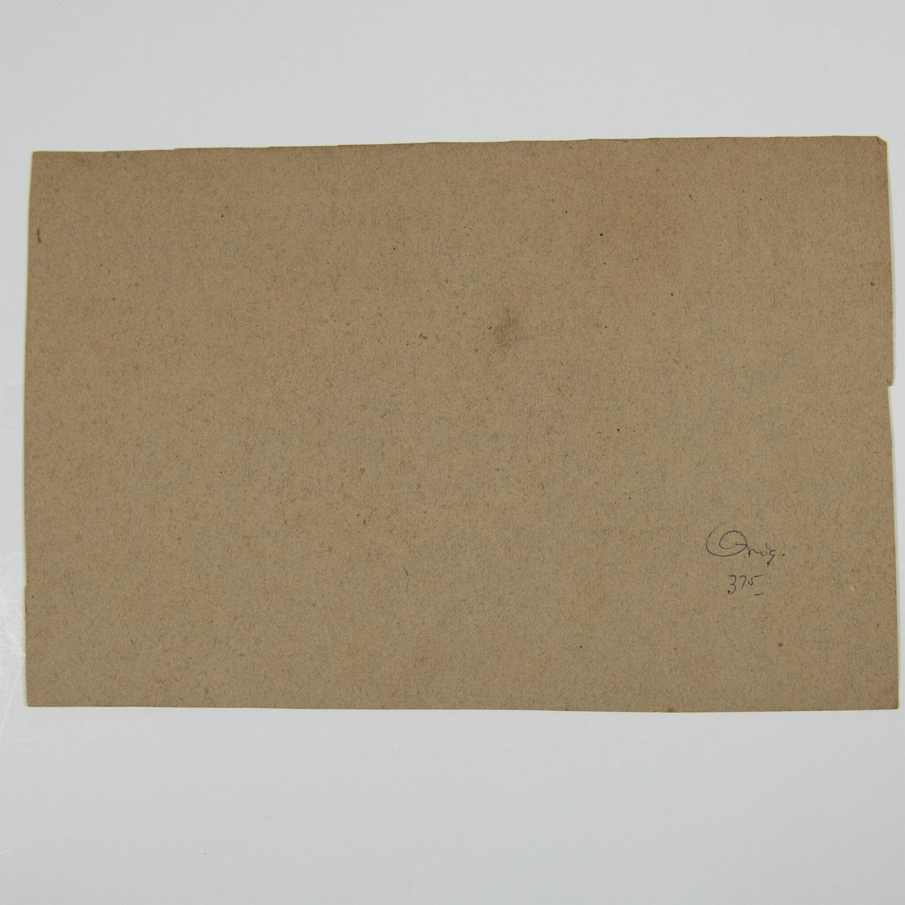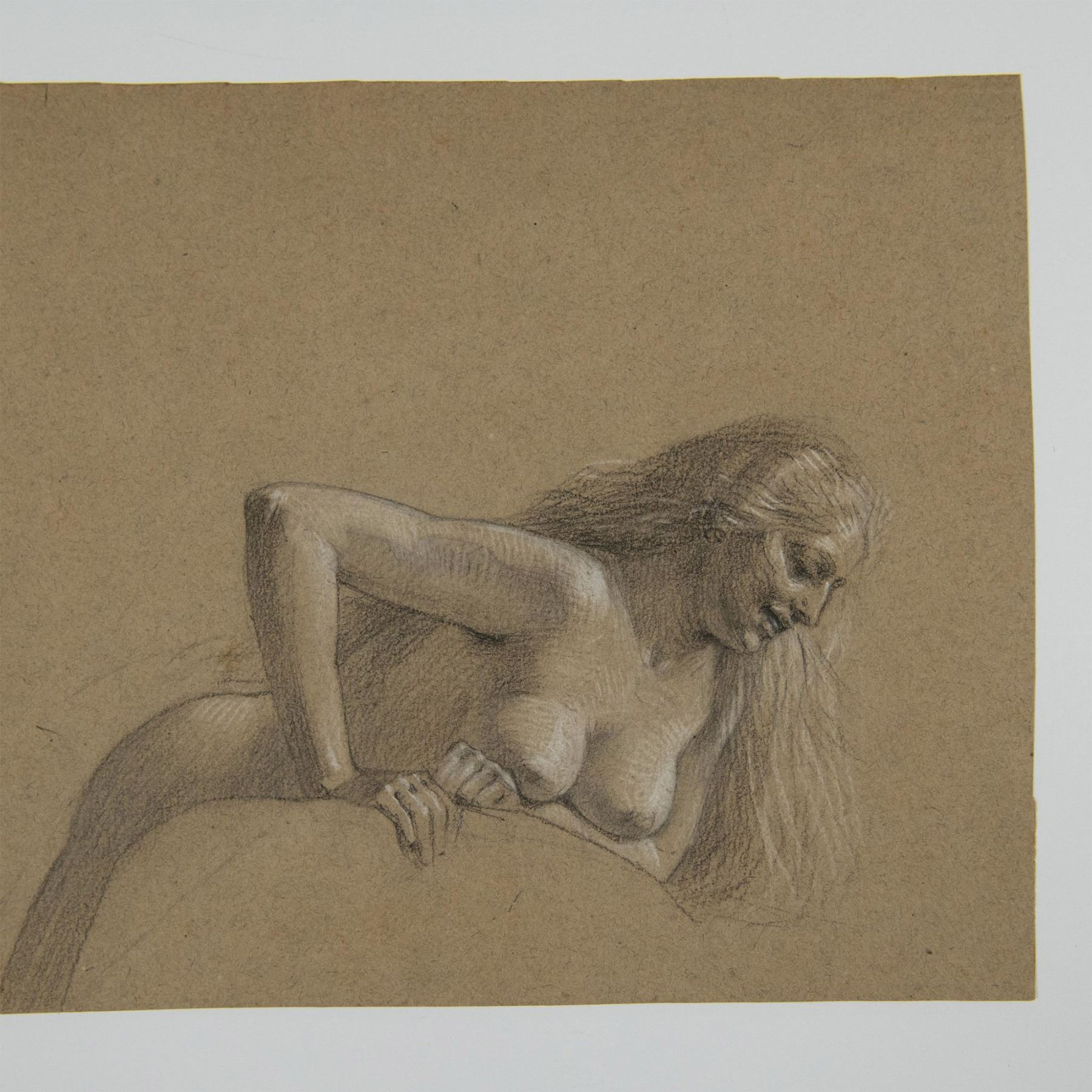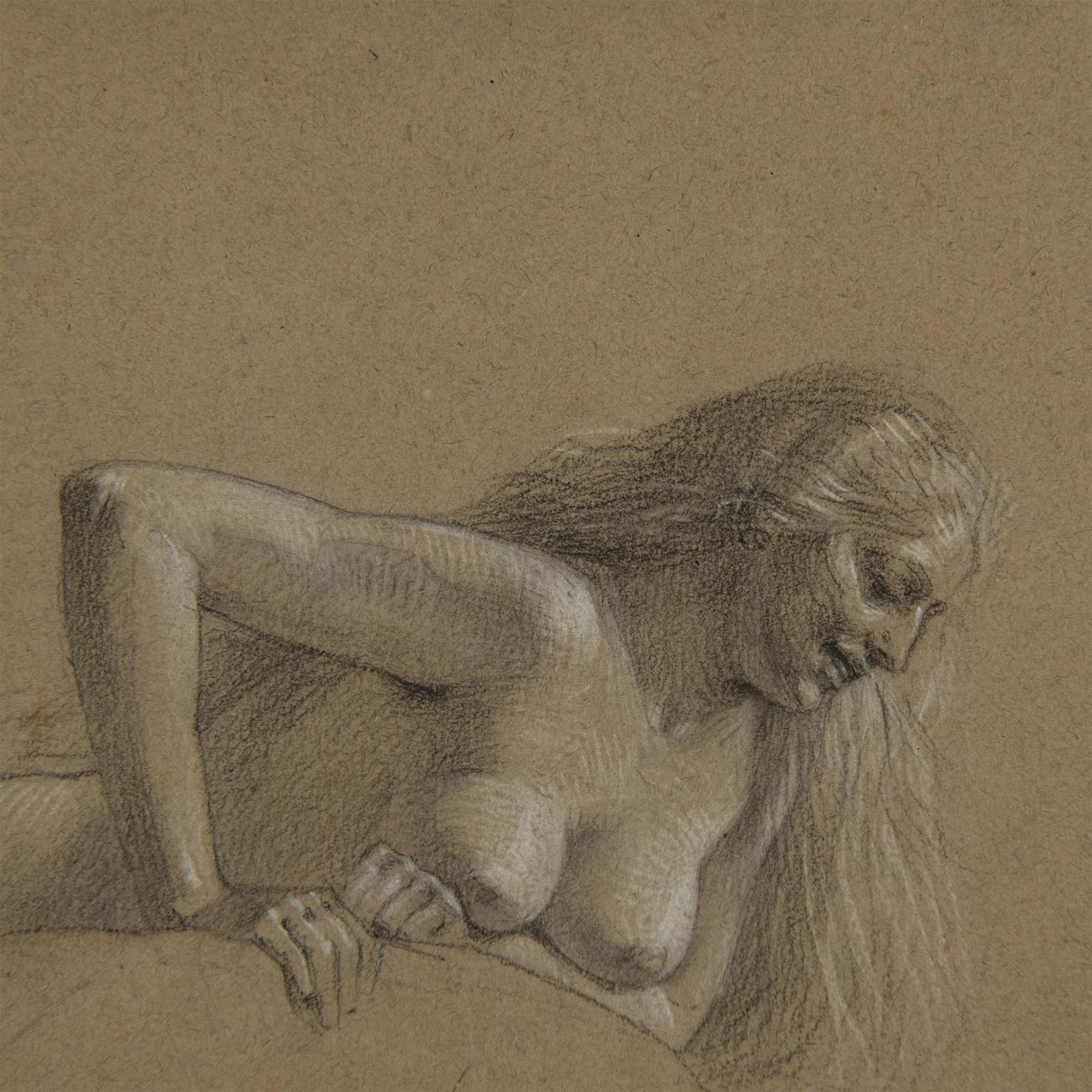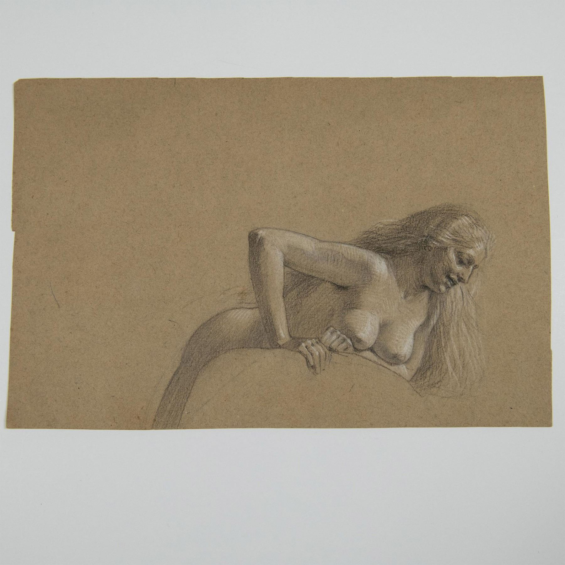 Rendered in delicate pencil and sanguine on beige paper. Exquisite nude study depicts the graceful form of a woman with flowing long hair, pushing something, and possessing an enigmatic expression