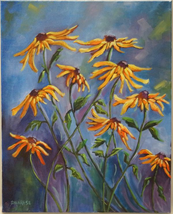 Original Oil Lazy Daisies by Judy Savarese, measures 16'' x 20'', signed in lower right corner by artist, features beautiful daisies catching a few rays, Artist Bio: Judith Savarese, originally from the Bootheel of Southwest New Mexico, now resides in Huntsville, Alabama where she continues to enjoy her painting.