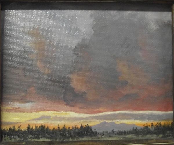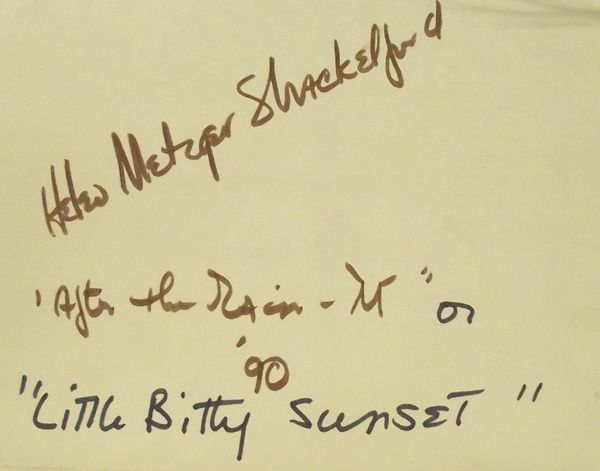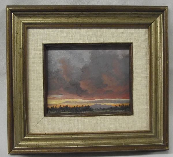 1990 Original Oil ''Little Bitty Sunset'' or ''After the Rain'' by Helen Metzger Shackleford (1928-2007)a renowned oil painter known for her western landscapes, juried artist in AskArt, Arizona artist, framed and matted, visual measures 3.5'' x 4.5'', signed and titled on back by artist, ready for hanging, depicts beautiful southwest sunset