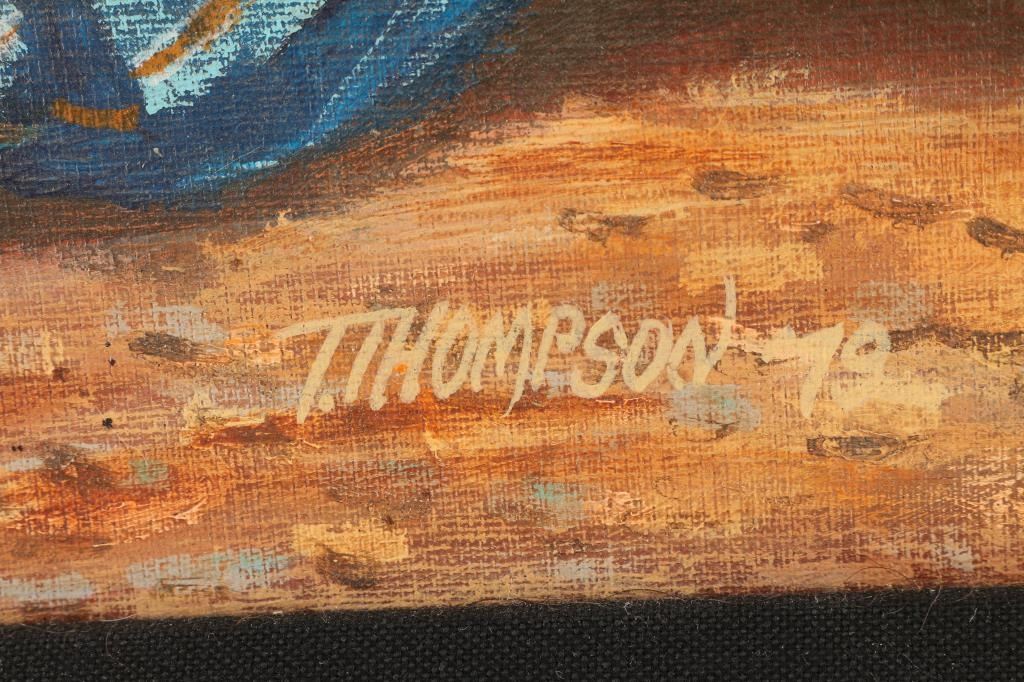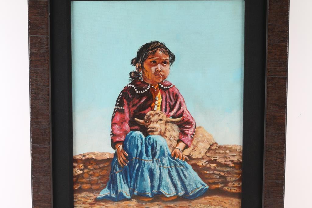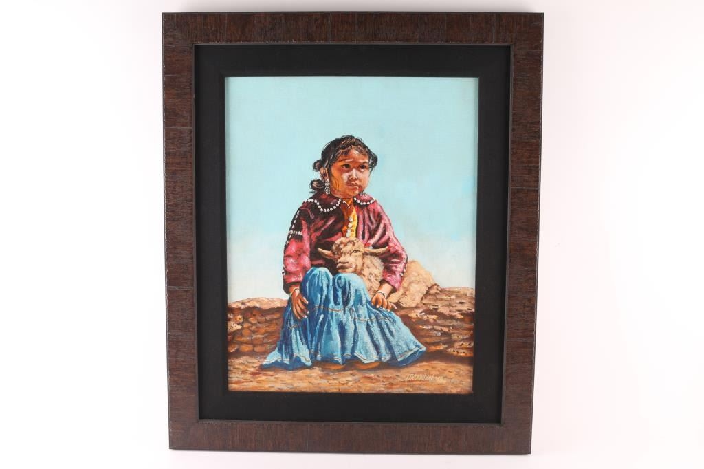By "Thompson" signed lower right dated 1979, in beautiful matte and wood frame depicting crazy eyed lost girl and her baby lamb. Measuring 19x15"