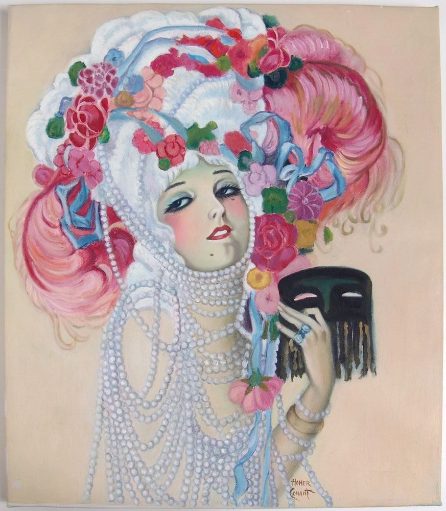 This is an original oil painting on canvas, based on the 1920s Homer Conant painting that was featured on the cover of a 1920s Theatre magazine. Similar to his Lady Pompadour and Marie Antoinette paintings but this girl has an even more ornate headdress and hairdo and is holding a masquerade mask. Unframed, but on stretcher bars and ready to be framed. Vibrant colors. Approx. 15 years old. Artist unknown. SIZE: 15 1/2" x 18".