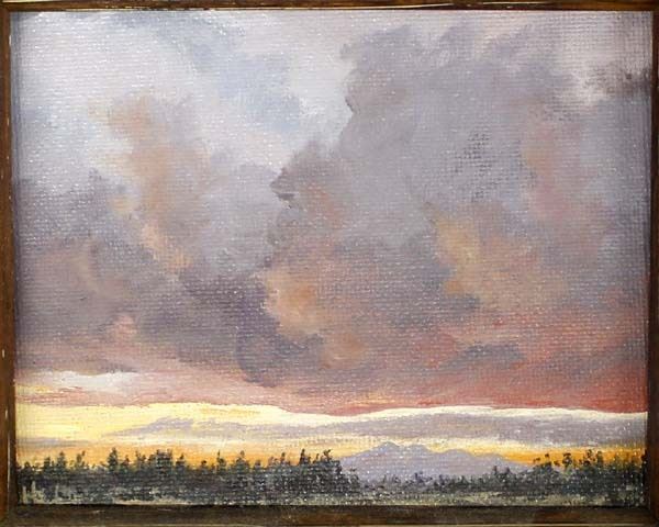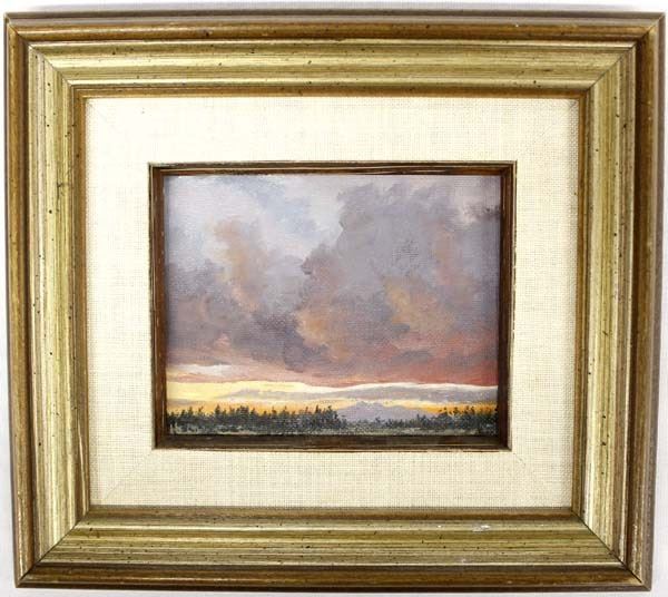Original Oil Painting ''After the Rain'' or ''Little Bitty Sunset'' by Helen Metzger Shackelford (1928-2007), signed on the front and on the back, visual measures 4'' x 5'', Helen lived in Arizona and was known for her cloud, landscape, and Native American paintings.