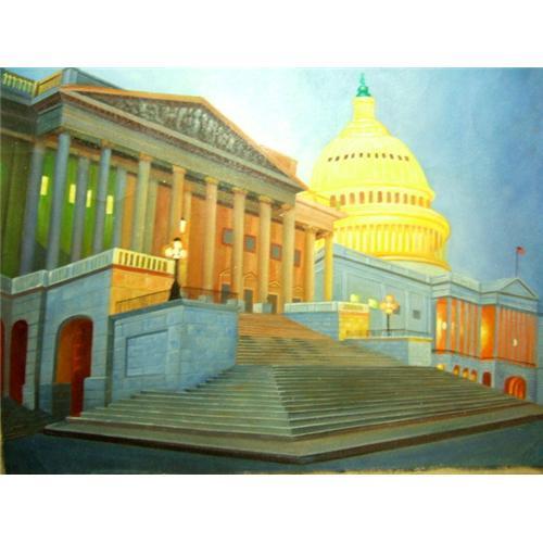 Original art work, oil on canvas titled "The Capitol." Done by a highly skilled artist. This particular painting is not stretched or framed. Please note: The photo showing painting framed and hanging is for perspective only. Item is located in US.