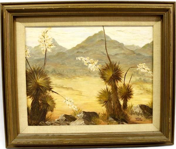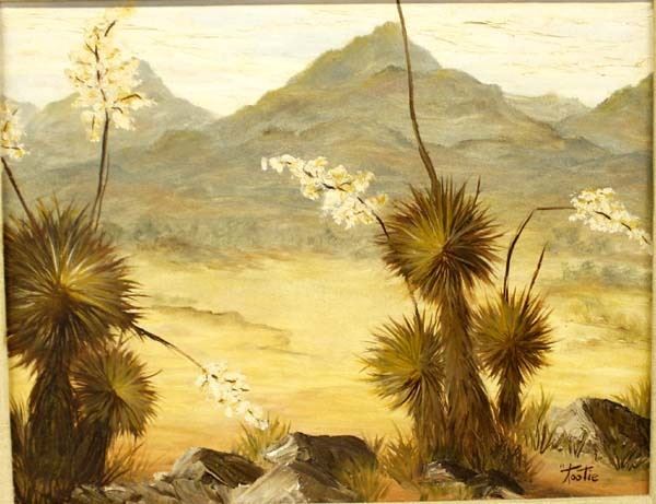 Original Oil Painting ''Yuccas'' by Tootie Fouratt, visual measures 13.5'' X 10.5'', framed and signed by the artist, FYI: ''Tootie Fouratt is a Texoma native whose art reflects her lifelong love of the American Southwest. After a teaching career in New Mexico during which she was surrounded by the mountains, forests, history, and culture, she immersed herself in pursuit of her art. She's been at it now for more than twenty years.''