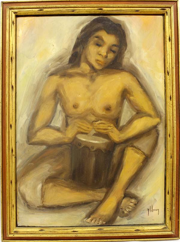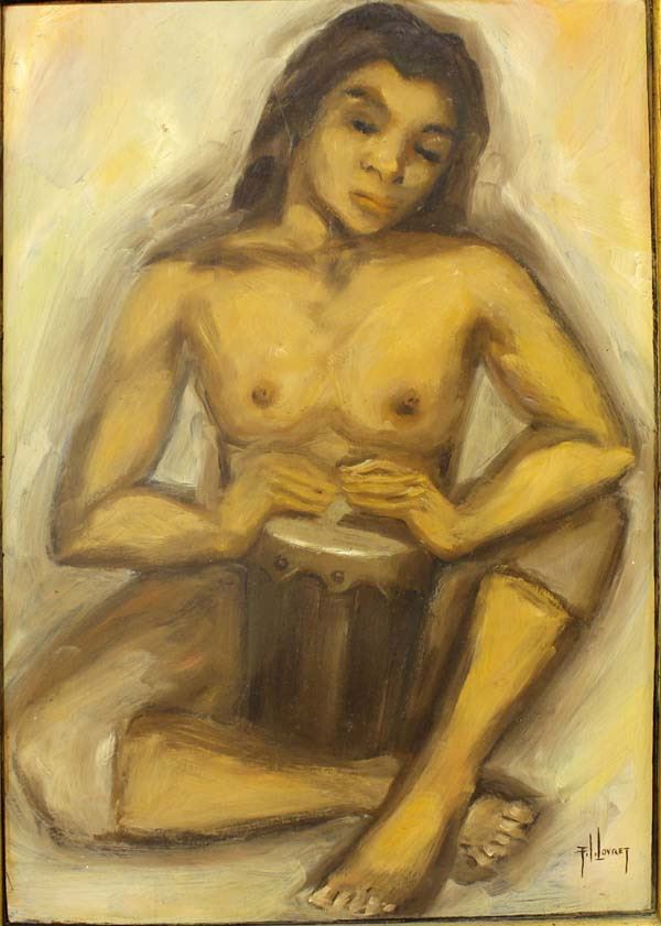 Vintage Original Oil Painting on Board ''Native Musician'' by Fredrick Ivar Lovret (born abt. 1916-2000), framed, visual measures 15'' x 21'' and is signed by the artist