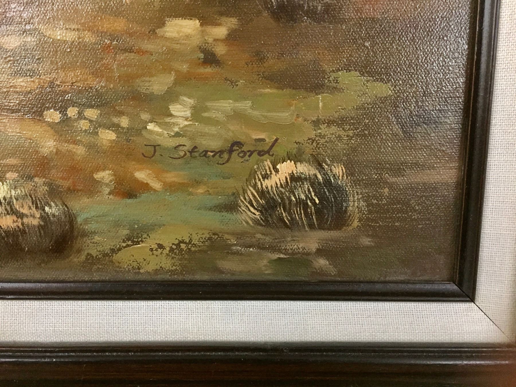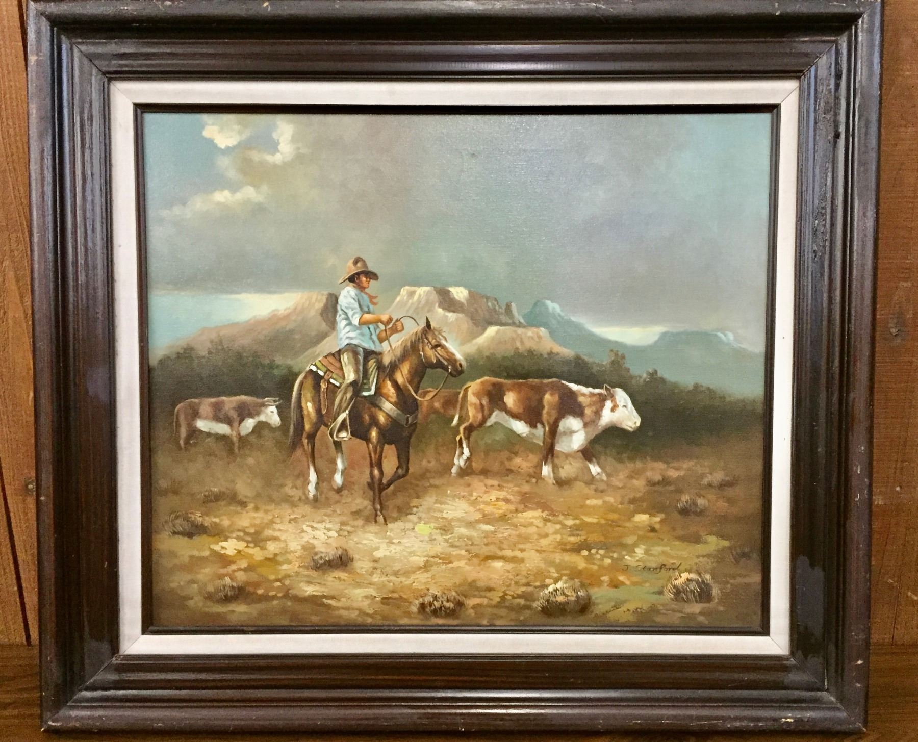 Description: For sale in this lot is an original oil painting featuring a Cowboy chasing a steer. It was signed by the artist J. Stanford.                                                                                                            Maker: J. Stanford.                                                                                                                   Approx. Age: Vintage.                                                                                                            Size: 32”w x 28” tall.                                                                                                                                                                                                                                 Condition: Good for its age, normal wear expected.                                                                                                                Please look closely at the pictures - they are an important part of our description.                                Shipping: There will be a $15 handling / packaging fee for shipping this lot. The actual cost of postage will be added on top of that.