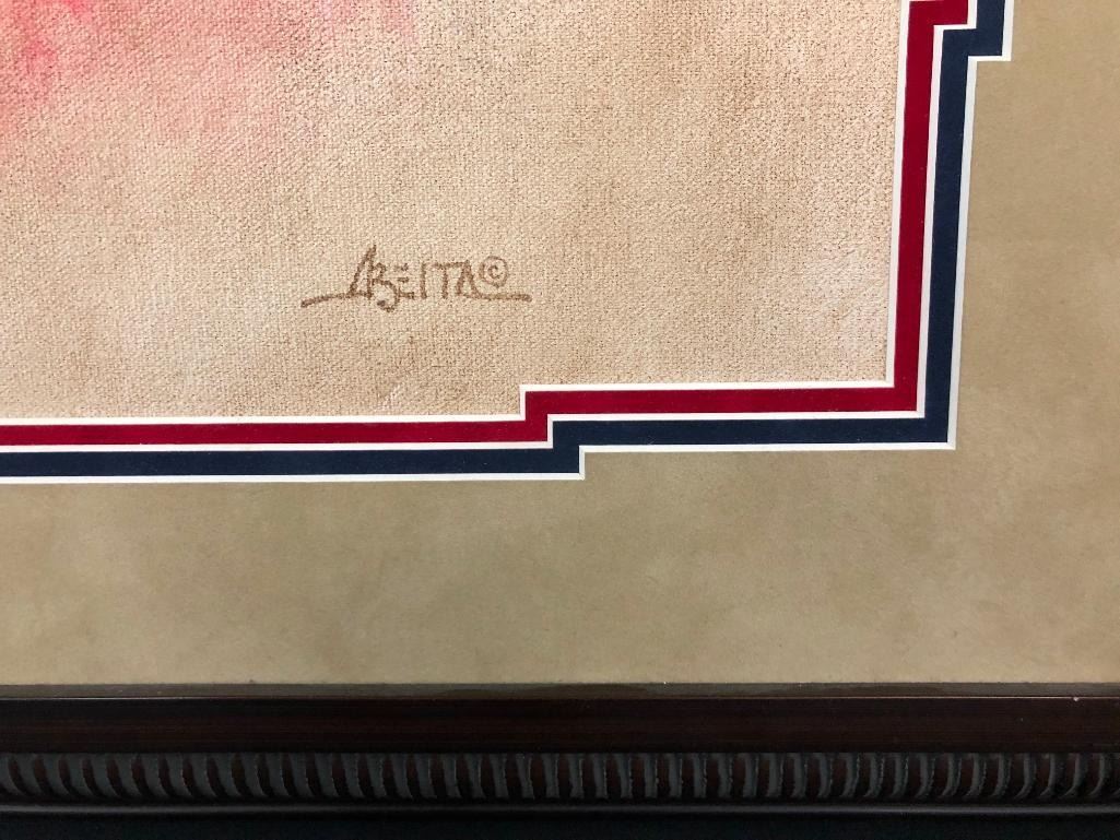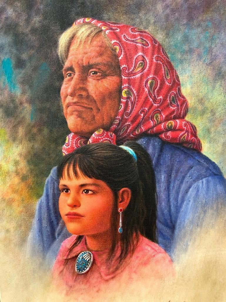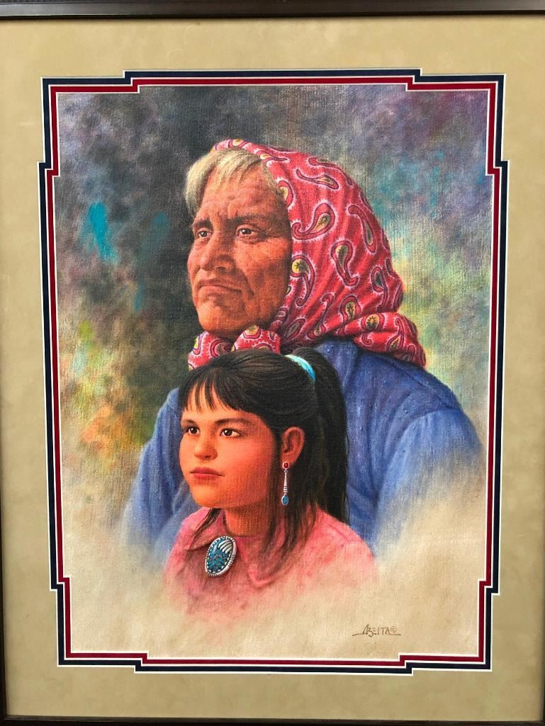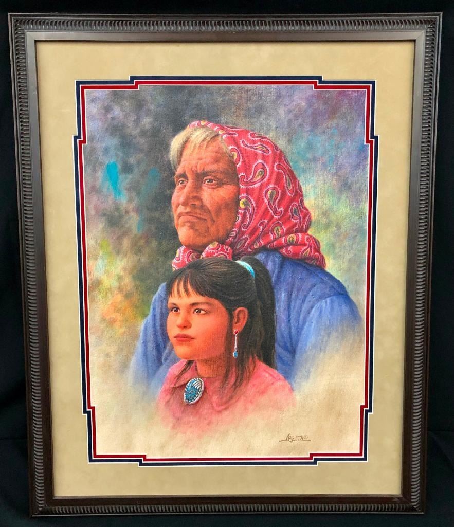 Presented for sale in this lot is a original oil painting featuring a mother and daughter created by Jimmy Abeita. Jimmy Abeita was born in Crownpoint, NM, he grew up drawing on paper bags and scratching images on sandstone while he was tending his family's sheep. As a young man he moved to Gallup and Abeita was working as a draftsman. His boss recognized Jimmy's talent and helped him get a scholarship at the American Academy of Art in Chicago. The rest is history, Abeita went on to become one of the most famous and talented Native painters of modern times. Maker: Jimmy Abeita. Approx. Age: Vintage. Size: 25-1/2 inches wide X 31-1/2 inches tall overall. Condition: Good for its age, normal wear expected. Please look closely at the pictures - they are an important part of our description. Shipping: There will be a $15 handling / packaging fee for shipping this lot. The actual cost of postage will be added on top of that. BUY IT NOW: If you would like to buy this item now without waiting for the auction to end (this option is only available up to 48 hours before the auction starts to close), the “Buy it Now” price is the high estimate of this lot. If you would like to end the auction early and pay the high estimate (plus applicable fees), please contact us by phone or email and reference this lot number.