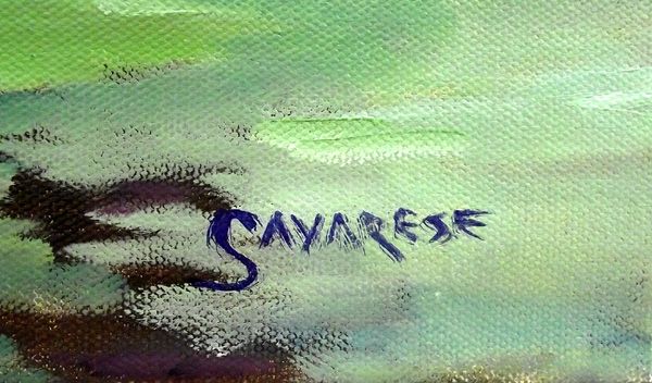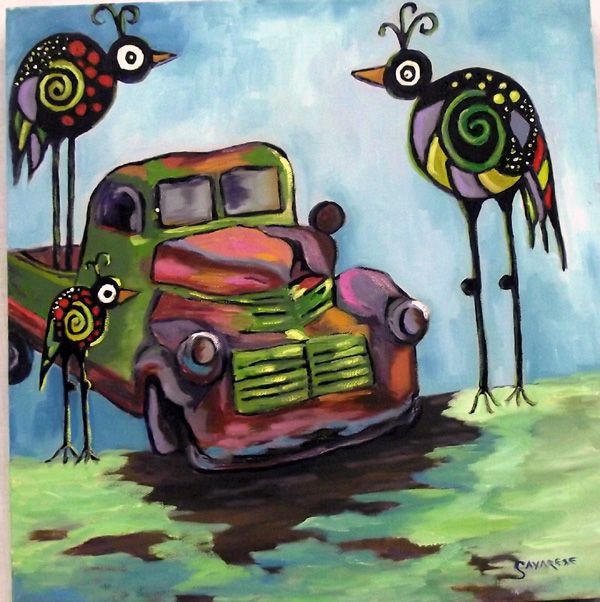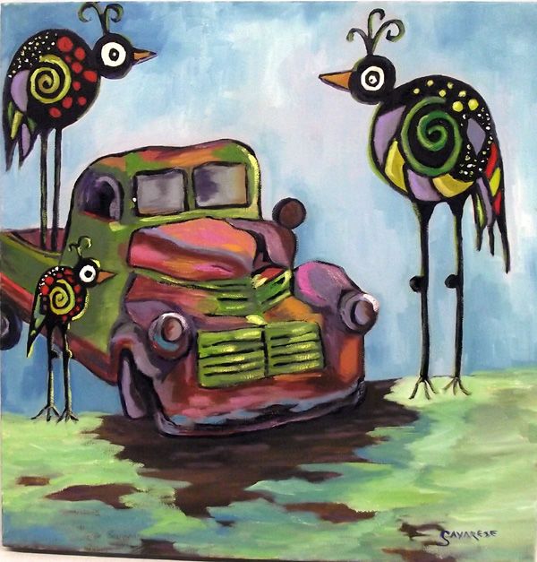 Original Oil Painting on Gallery Canvas by Savarese. This Brightly colored painting is titled ''Stuck! Now What?'' and measures approx. 18''H x 18''W. Judy was born and raised in the "Bootheel" of New Mexico amid the Chihuahuan desert. The desert has been her inspiration in many of her paintings. She started the series "Happy Birds", depicting the Desert Quail that survive the Chihuhuan Desert life, in Southern New Mexico. The artist is self taught, has won numerous awards and has shown and sold in galleries in New Mexico, Texas & Arizona. Signed on lower left.