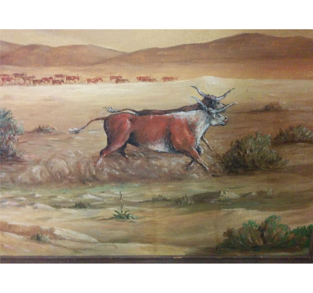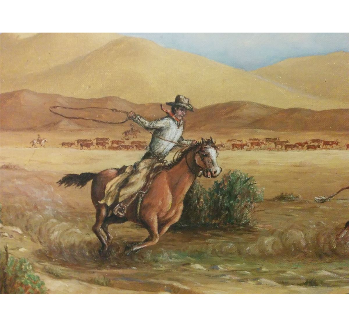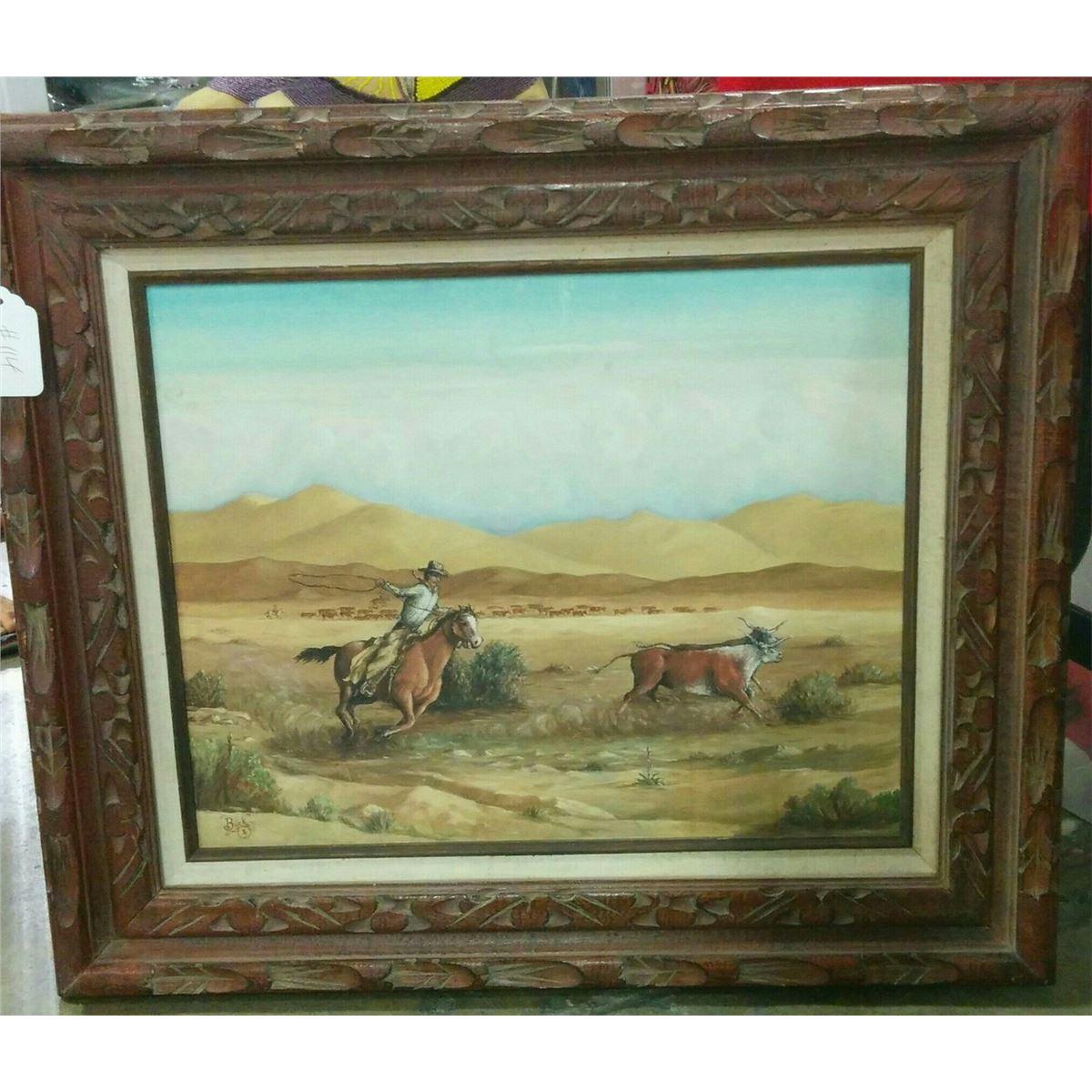 1960's original oil on canvas painting signed by Buck Hensley, San Diego, CA artist. Picture measures 16x20 inches. Artwork depicts a cowboy and his horse in the process of lassoing two bulls. Shipping $32.00.