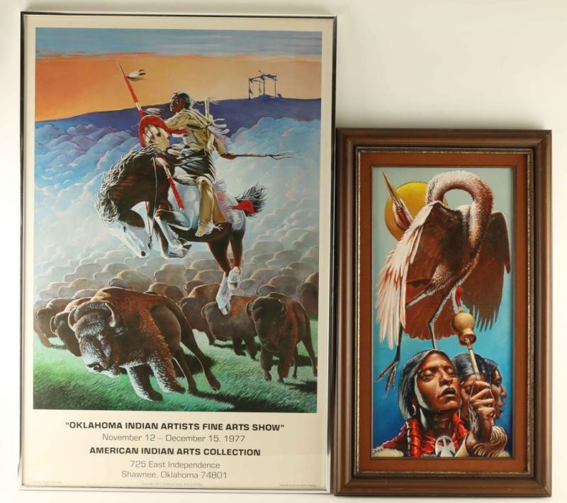 Original oil depicting three Indians with ceremonial rattle and a crane and measures 11 1/2" x 24" in wood frame. Hand signed lower middle. Print is from the Oklahoma Indian Fine Artists Indian Art Show 1977 depicting Indian on horseback and measures 38 1/2" x 24 1/2" in metal frame.