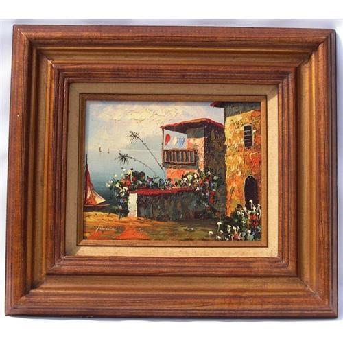 What a wonderful painting this is, I'd certainly love to live here. A marvelous Mediterranean villa over looks the sea with a walled garden to the side. Clothes blowing in the ocean breeze hang from the balcony. The frame is wood with the interior rim around the painting done in canvas. The actual canvas measures 8" by 10" and with the frame it measures 16" by 18". I compared the signature with the listed Rossini's but this one (at least to my eye) doesn't seem to match any of them so I can't tell you anything about the artist. But it is a lovely piece at a bargain price.