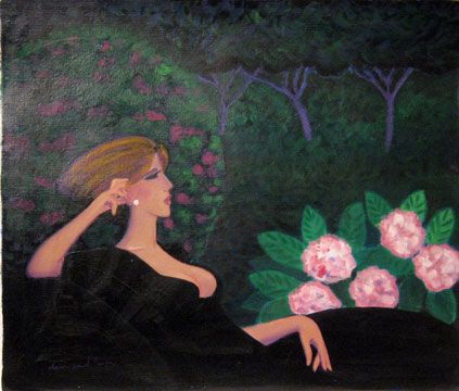 REVERIE IN THE PARK Oil on Canvas by Denis Paul Noyer - 24 x 20. Denis Paul Noyer (b. 1940) is a French artist working in a revived Art Deco style. Noyer is a second generation artist and son of listed artist Philippe Noyer. He had the privileged position of painting from an early age with the guidance of a world famous artist as a father and tutor. Noyer's canvases recall the angular lines and simplicity of painting during the 1920's. The Jazz age is seen in his depictions of chic women with bobs who lounge in elegant positions.