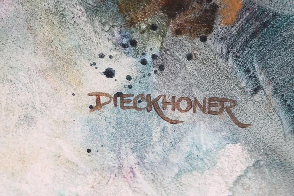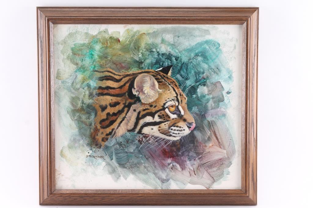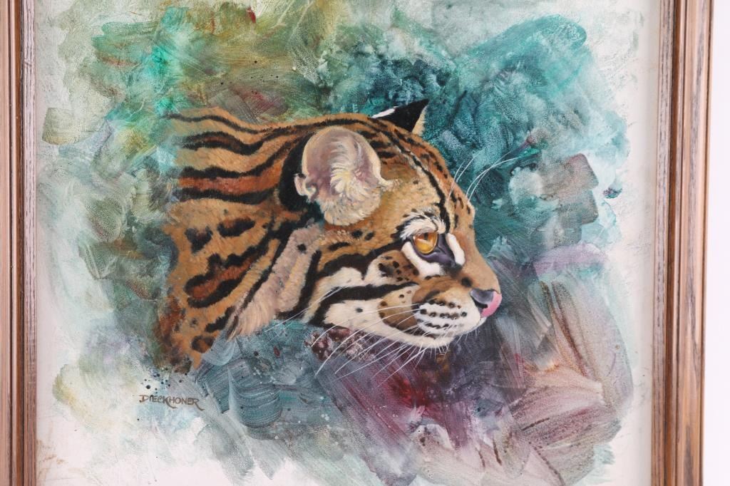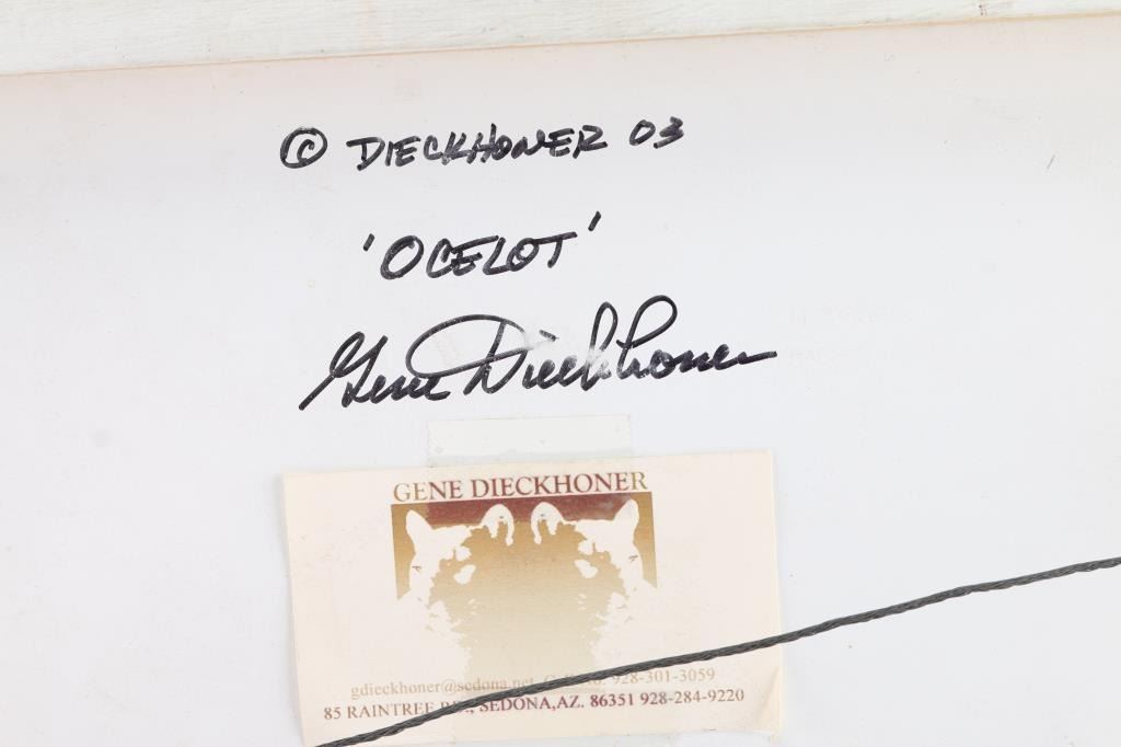 Depicts an ocelot head with an abstract background. Signed lower left. 17 x 15 1/2". In wood frame. Gene Dieckhoner was born 1940 and is active, lives in Arizona, known for animals and landscapes.