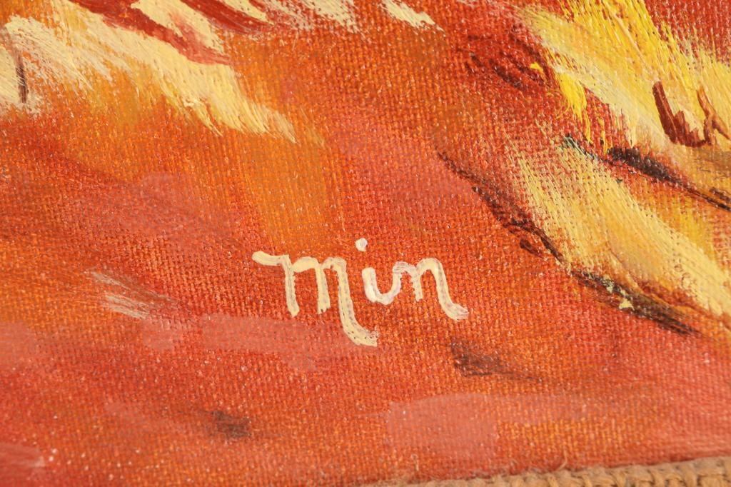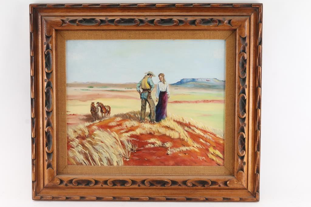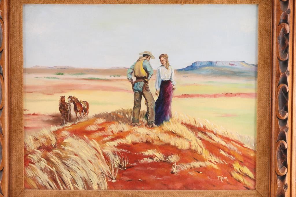 Depicts cowboy and lady in open field, mountains in distance, with saddled horses nearby. Measures 19 x 16". In carved wood frame.