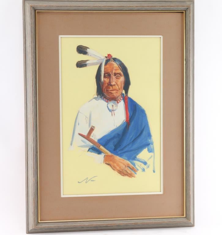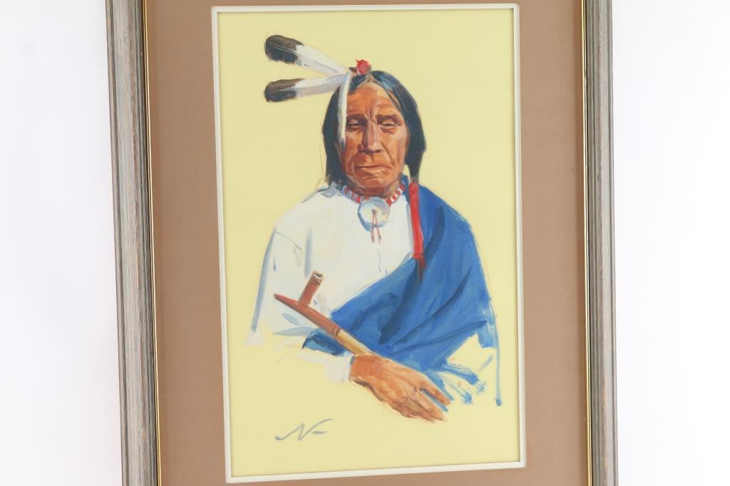 Depicting Indian Chief with pipe Signed lower left. Double matted in wood frame. 22 x 13 1/2".