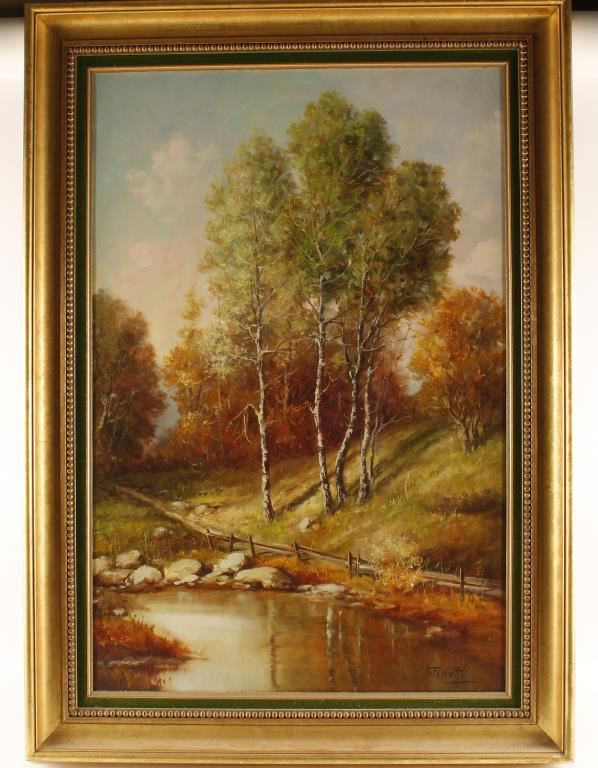Woodland landscape with fence and pond in the foreground. Image measures 23 1/2"x 35 1/4" in gold wood frame with a green velvet inset.